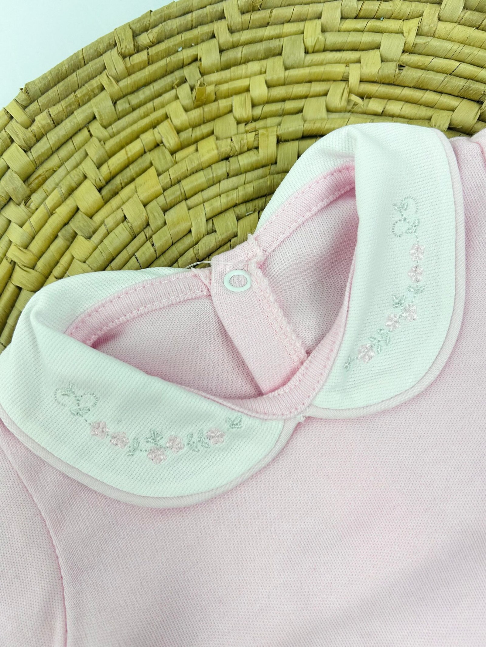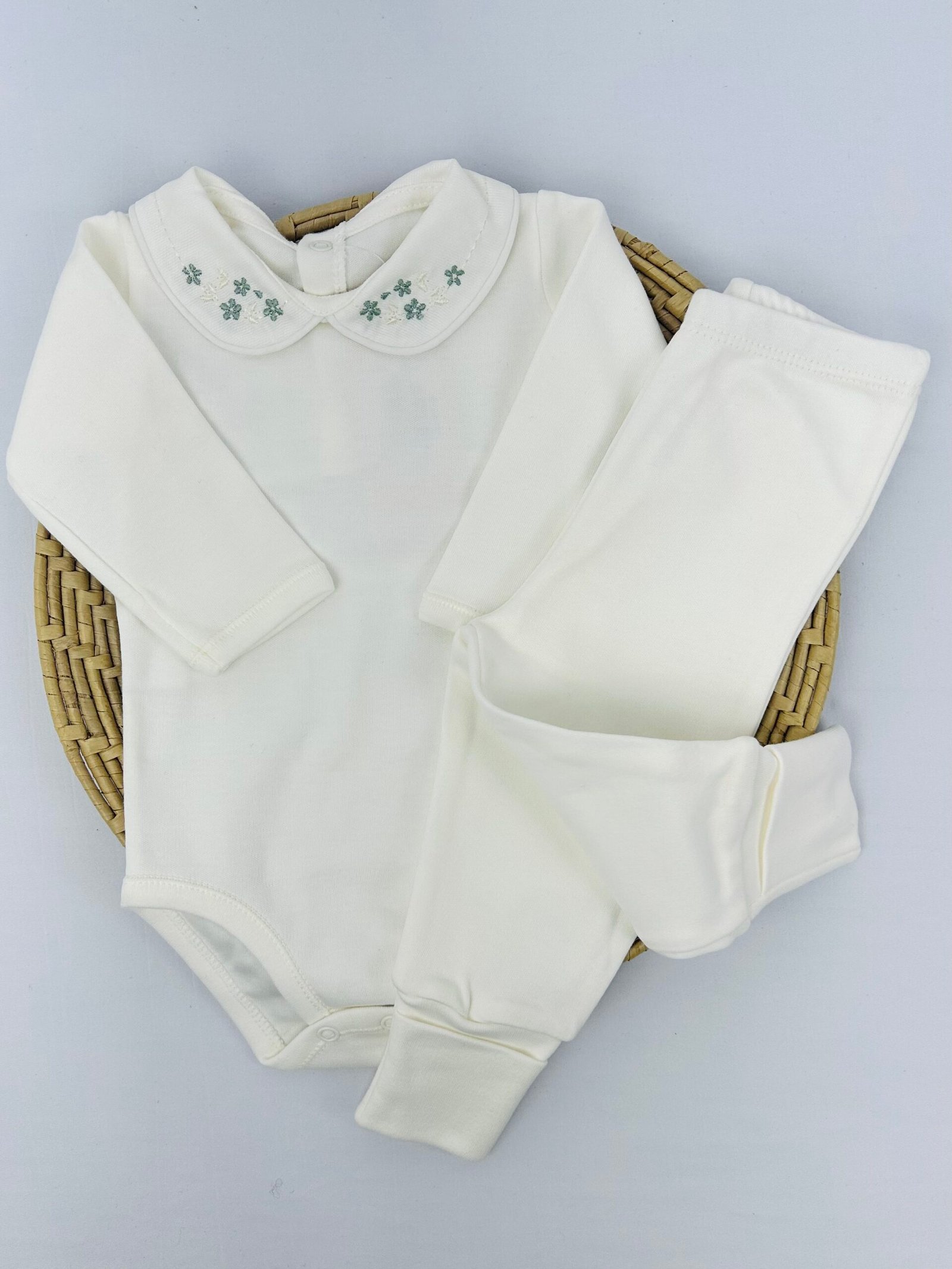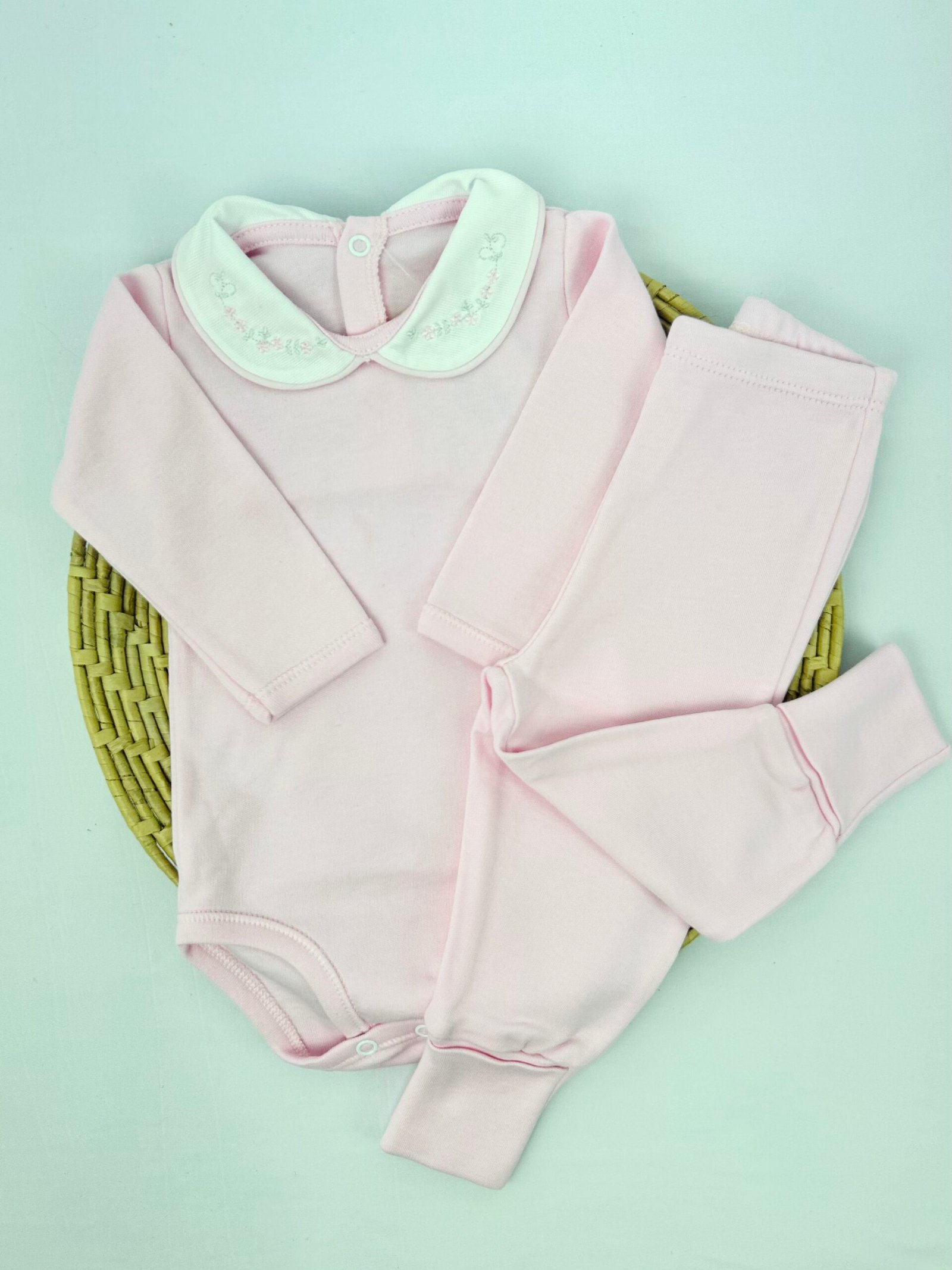 Conjunto composto por body de manga longa e calça. O body tem gola com bordado de flor visível na imagem, fechamento por botão e acabamento simples. A calça acompanha o conjunto, com modelagem básica e punhos ajustados.