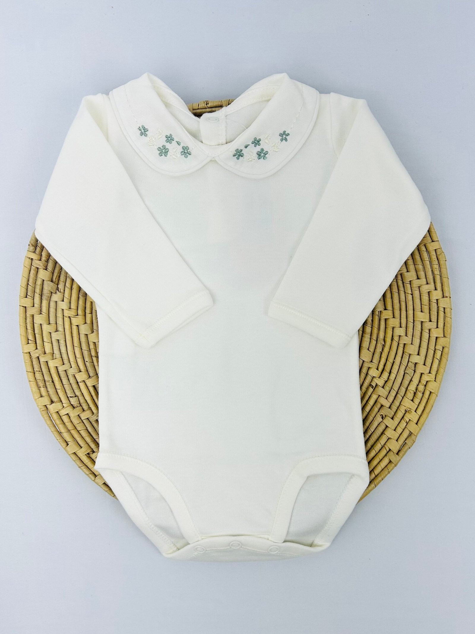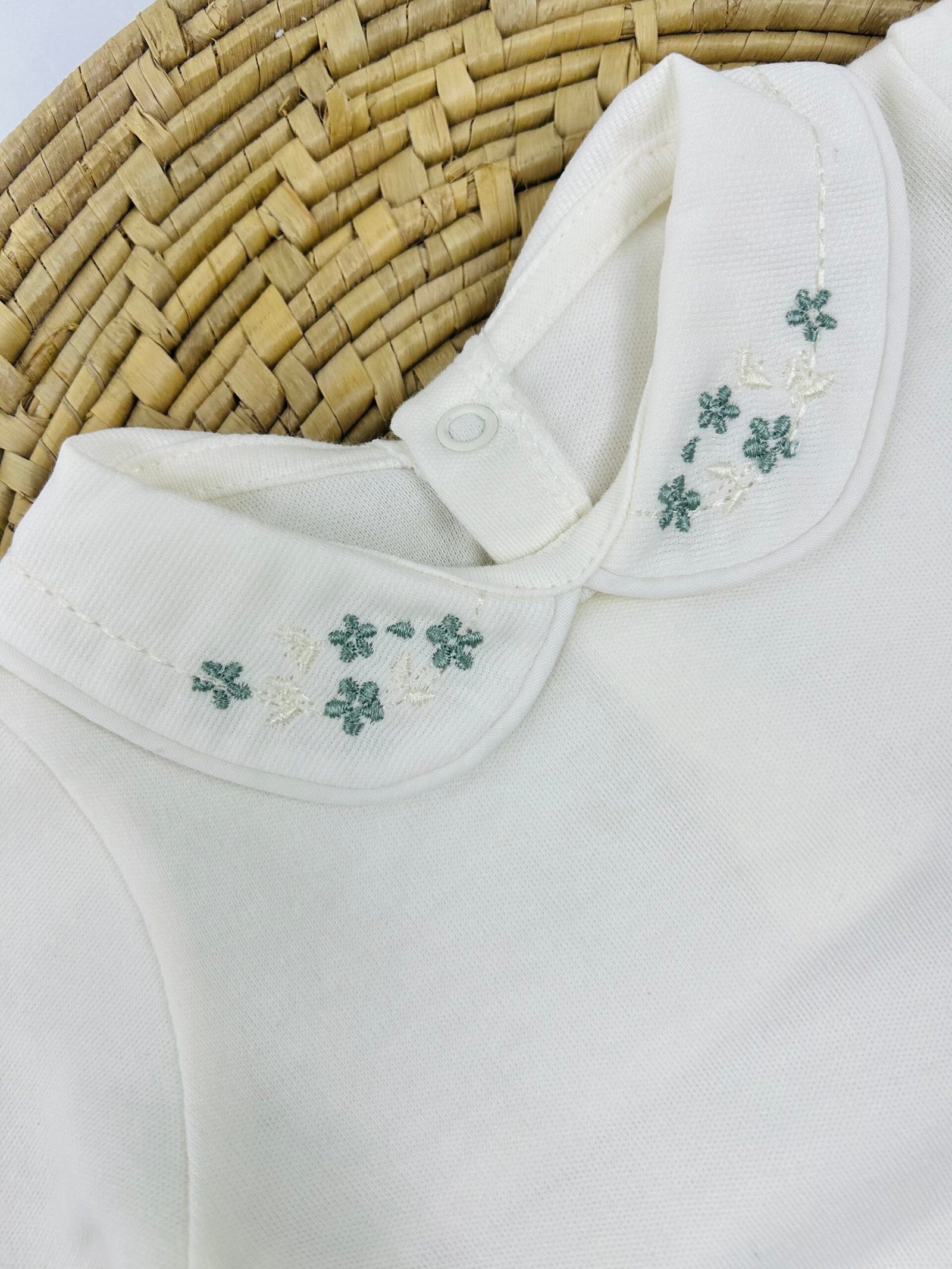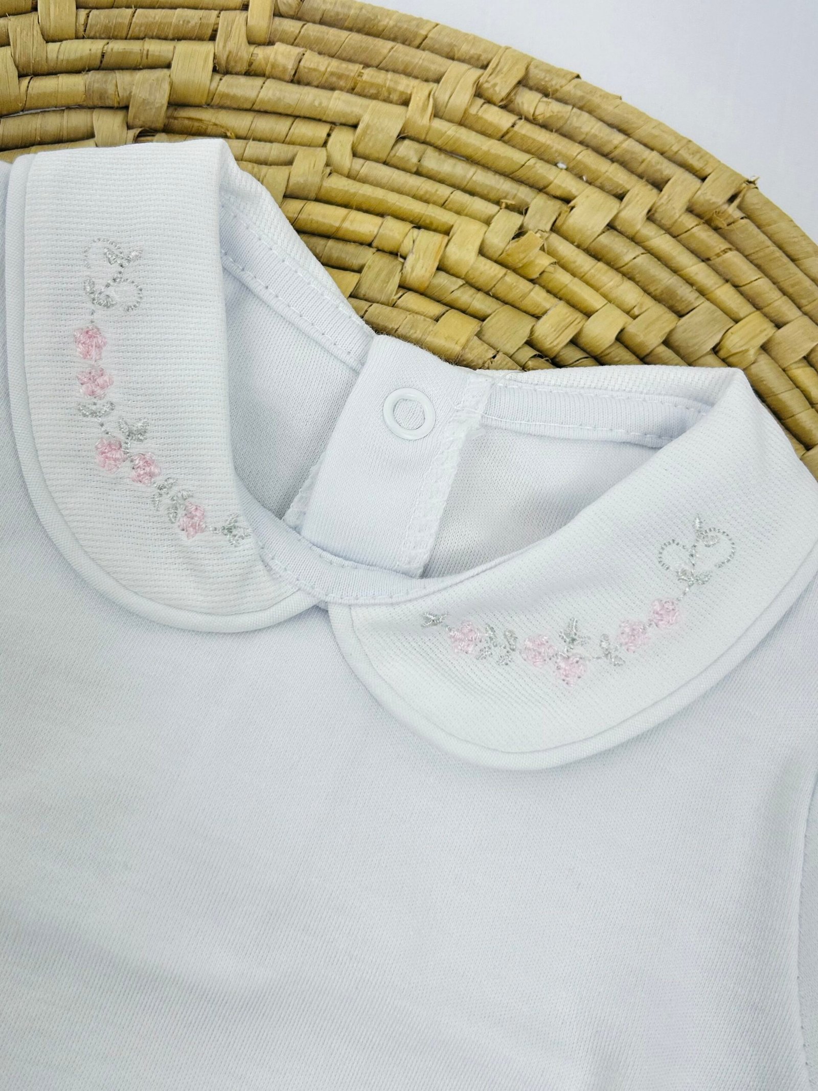 Conjunto composto por body de manga longa e calça. O body tem gola com bordado de flor visível na imagem, fechamento por botão e acabamento simples. A calça acompanha o conjunto, com modelagem básica e punhos ajustados.
