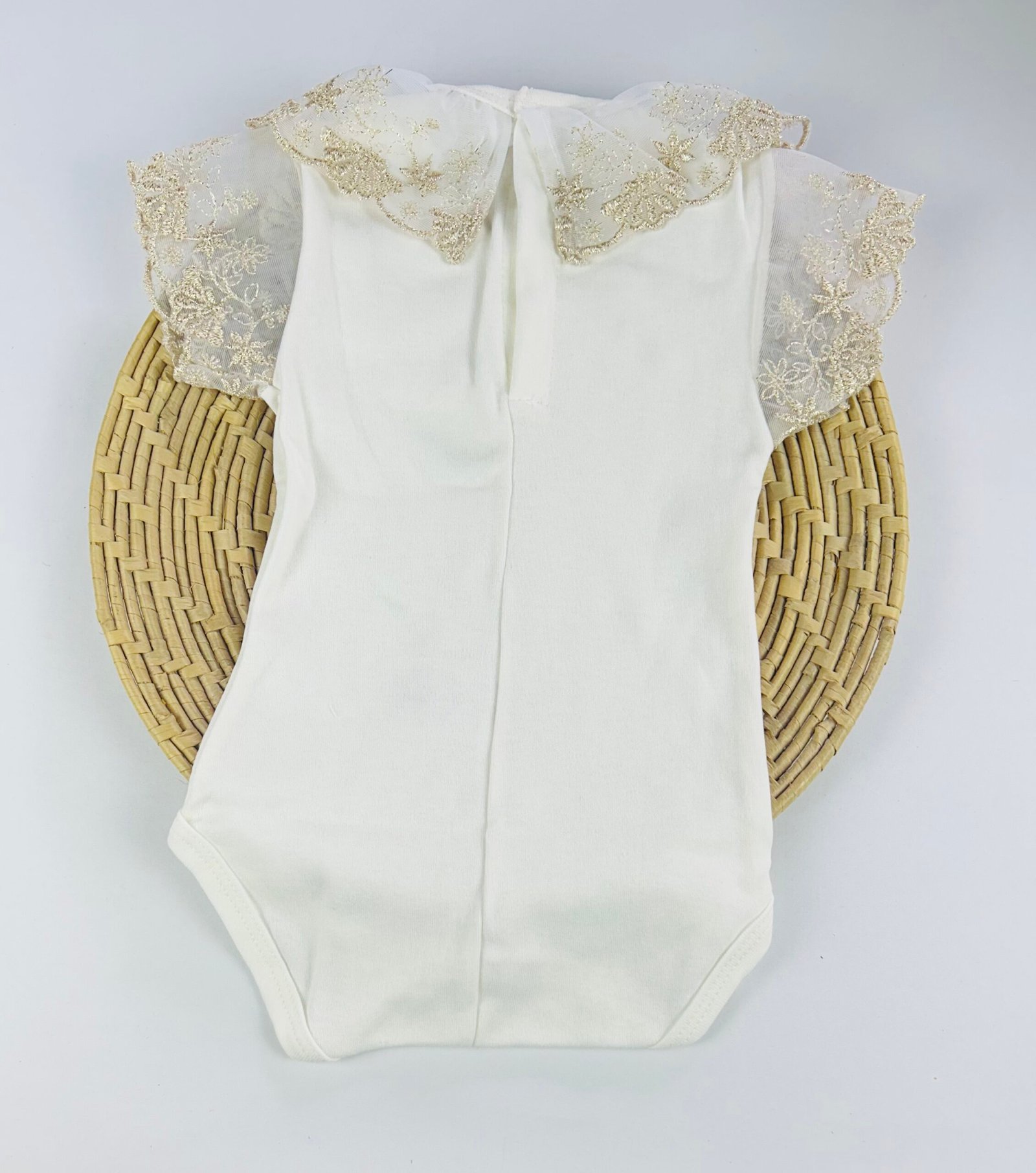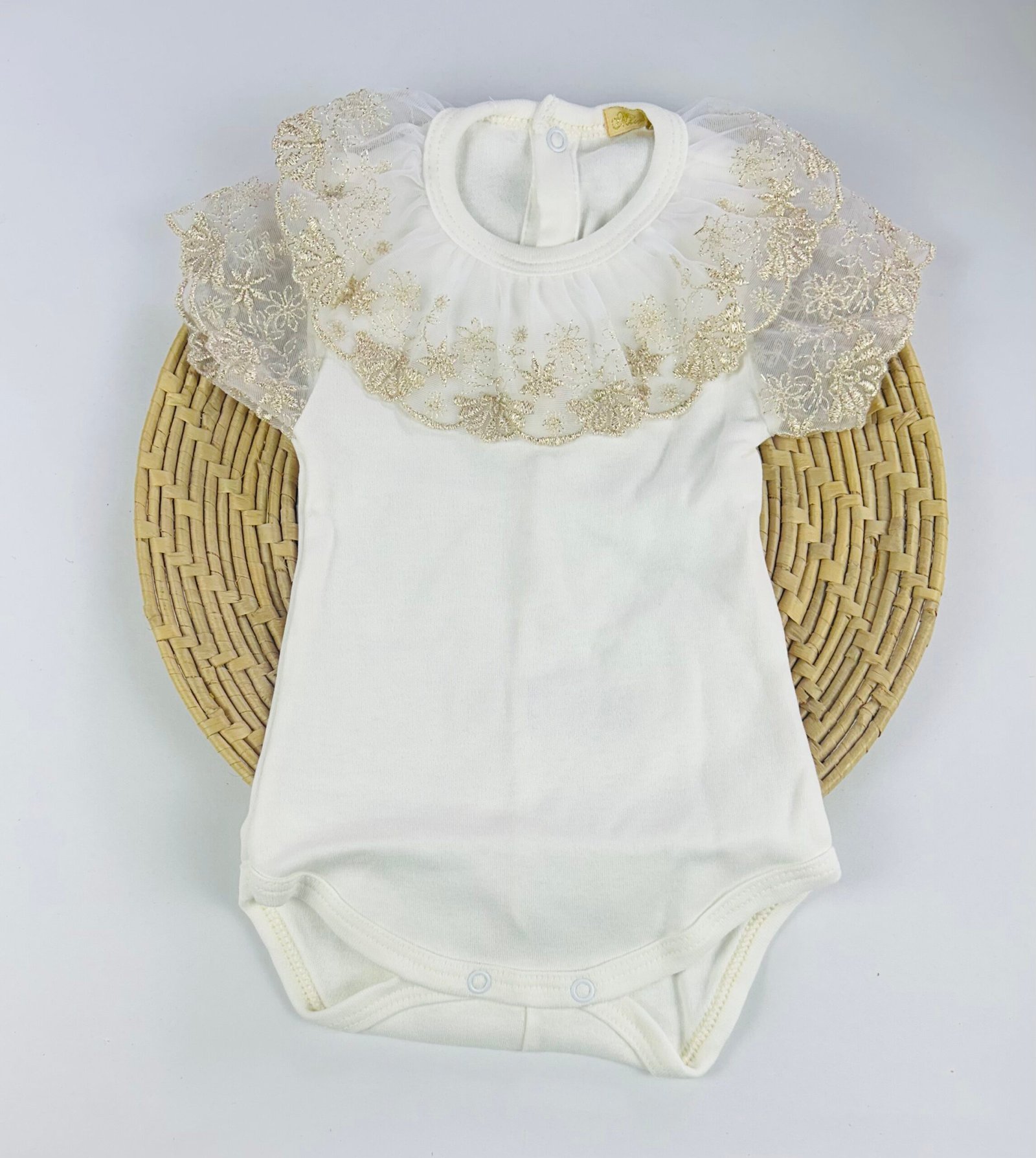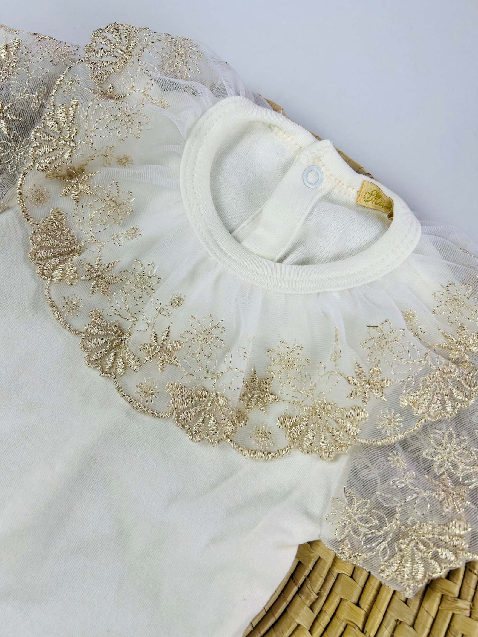 A gola e as mangas decoradas com renda dourada formam um visual único e elegante, perfeito para ocasiões como batizados, aniversários, festas e registros fotográficos. O acabamento refinado valoriza ainda mais a peça, transformando o body em um verdadeiro destaque no enxoval.
