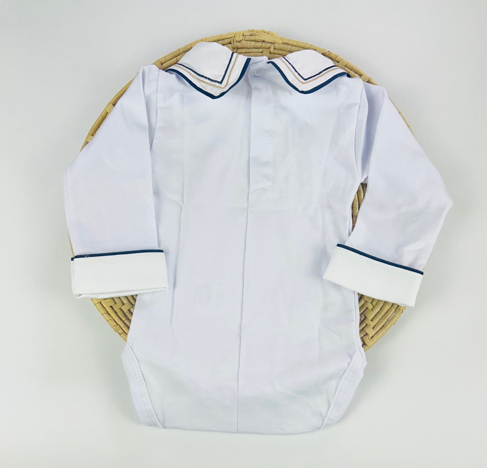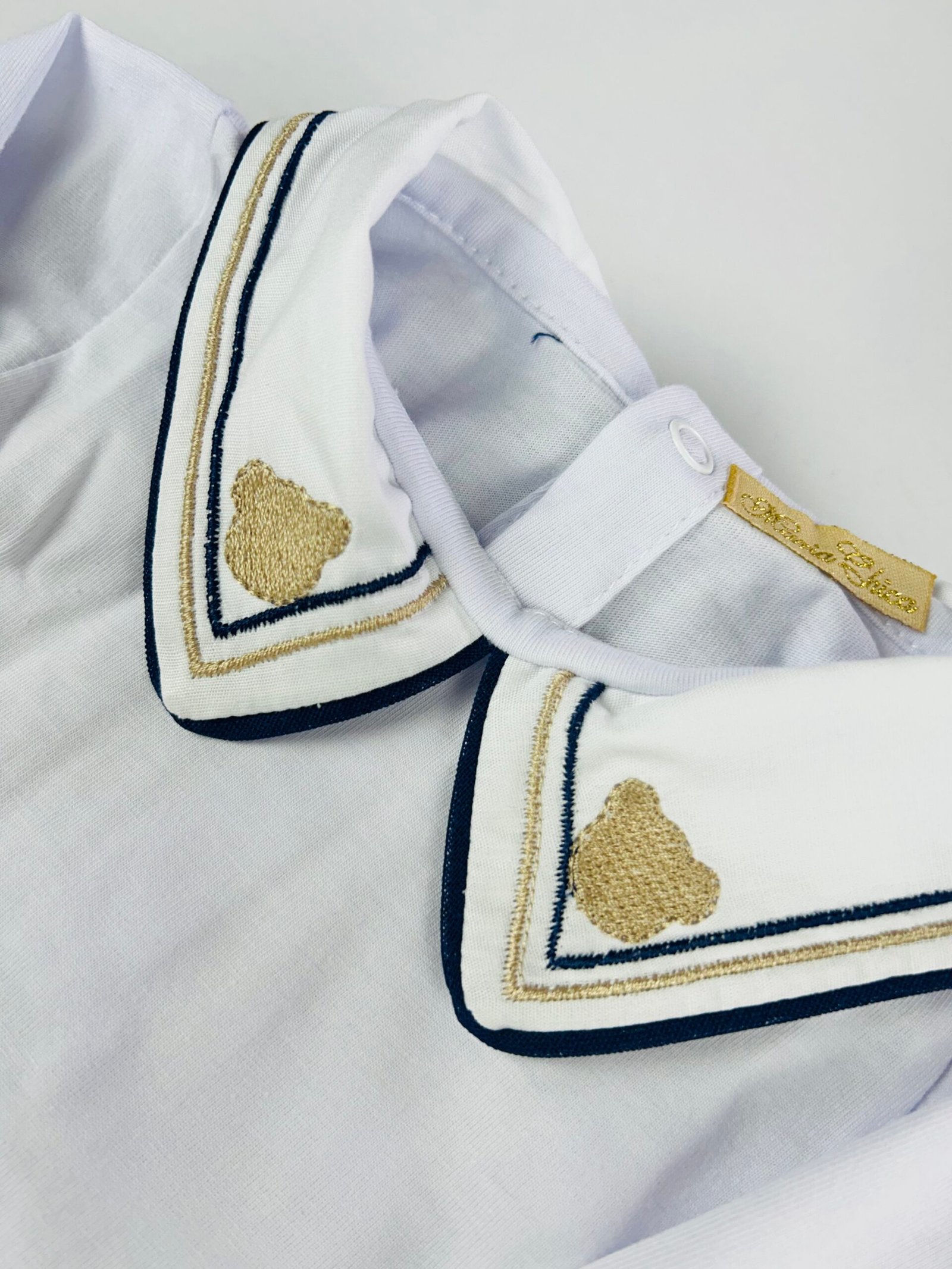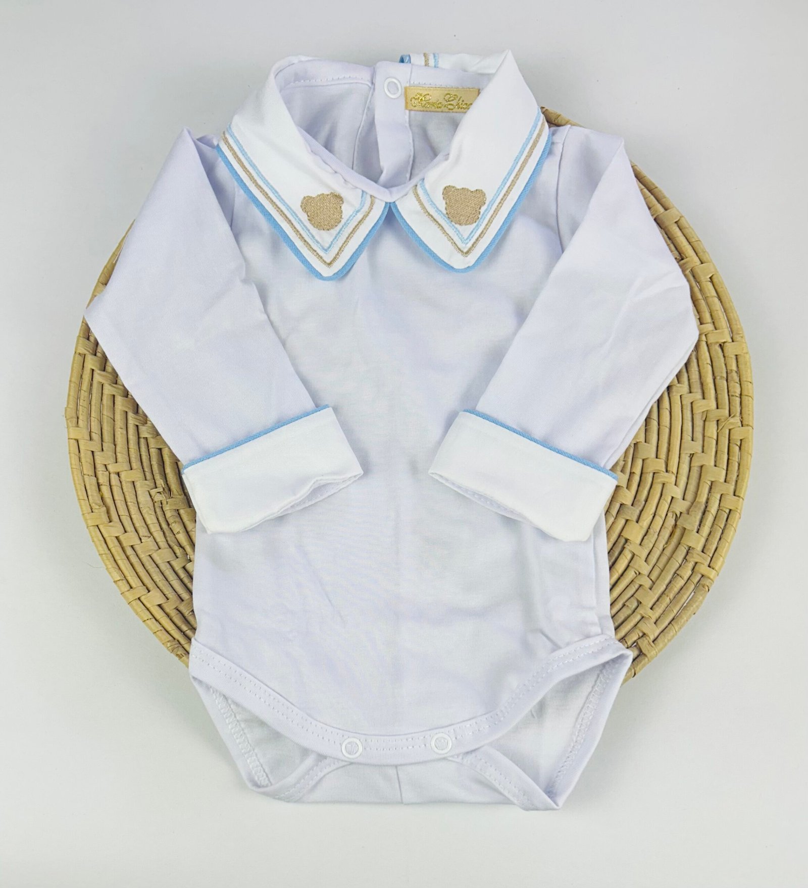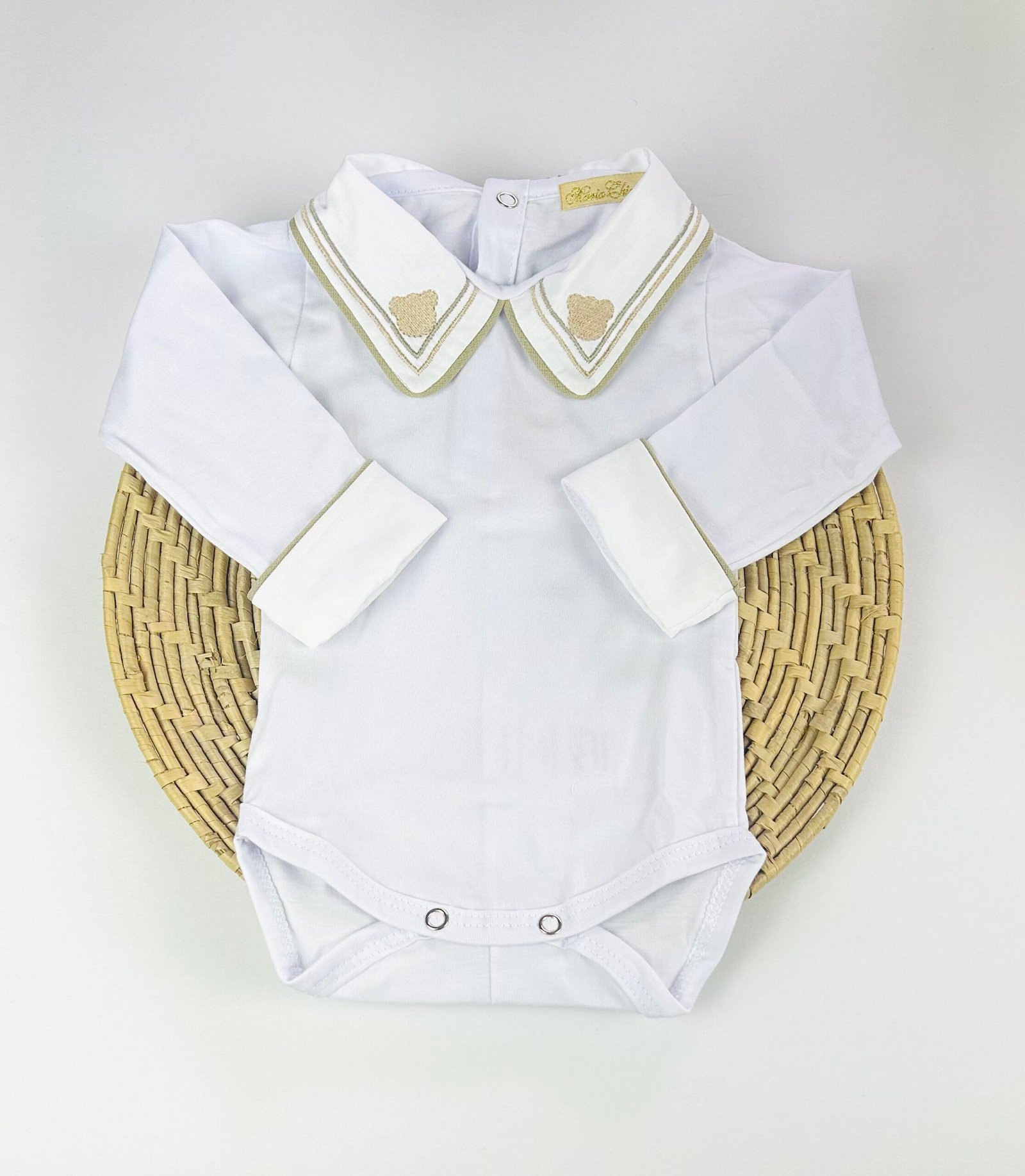 O modelo possui gola branca com bordado de ursinho feito à mão, além de acabamento delicado em tom neutro, que traz um toque clássico e artesanal à peça. As mangas longas garantem proteção térmica, sendo perfeitas para dias mais fresquinhos ou para compor looks elegantes desde a maternidade.