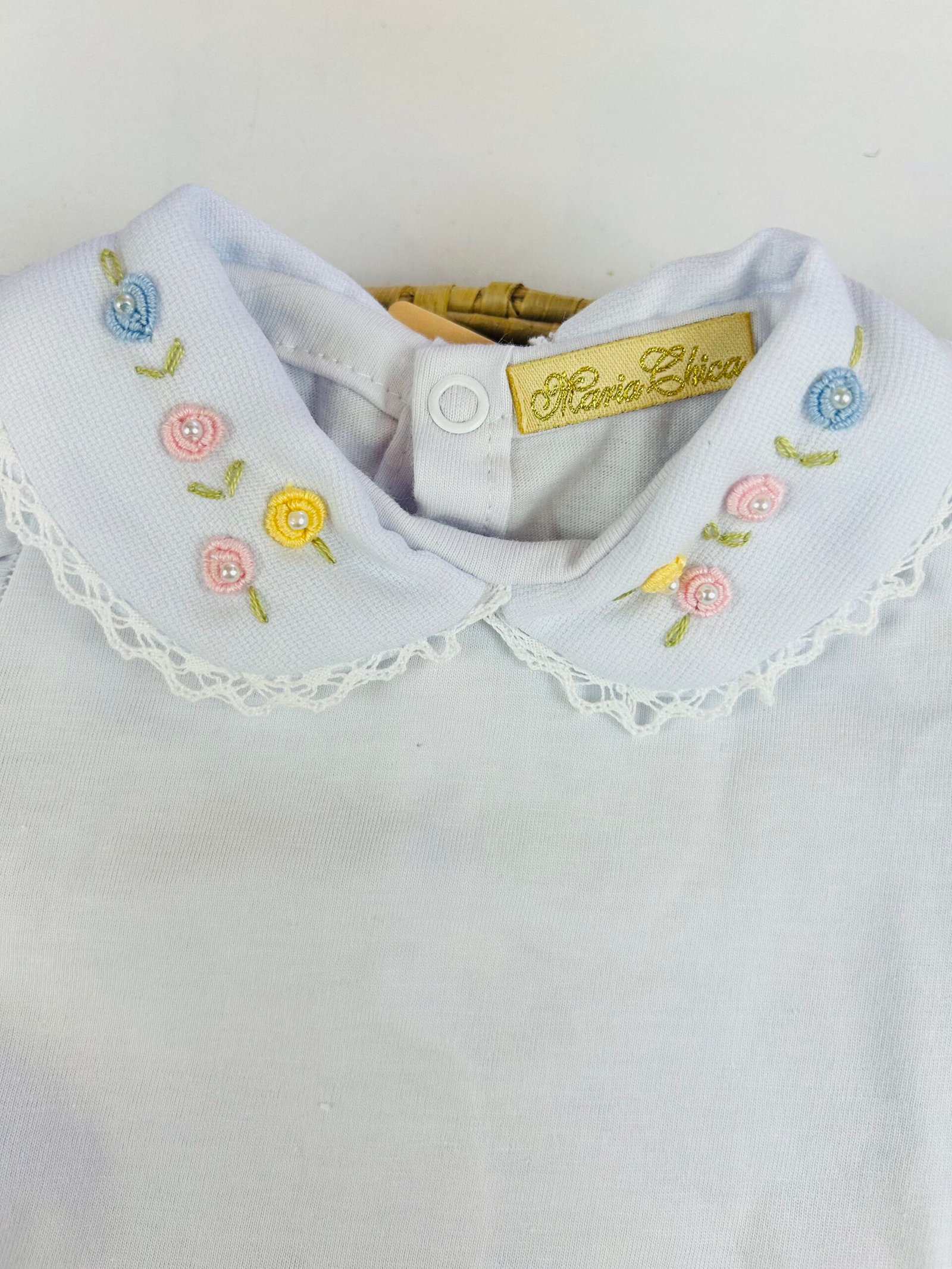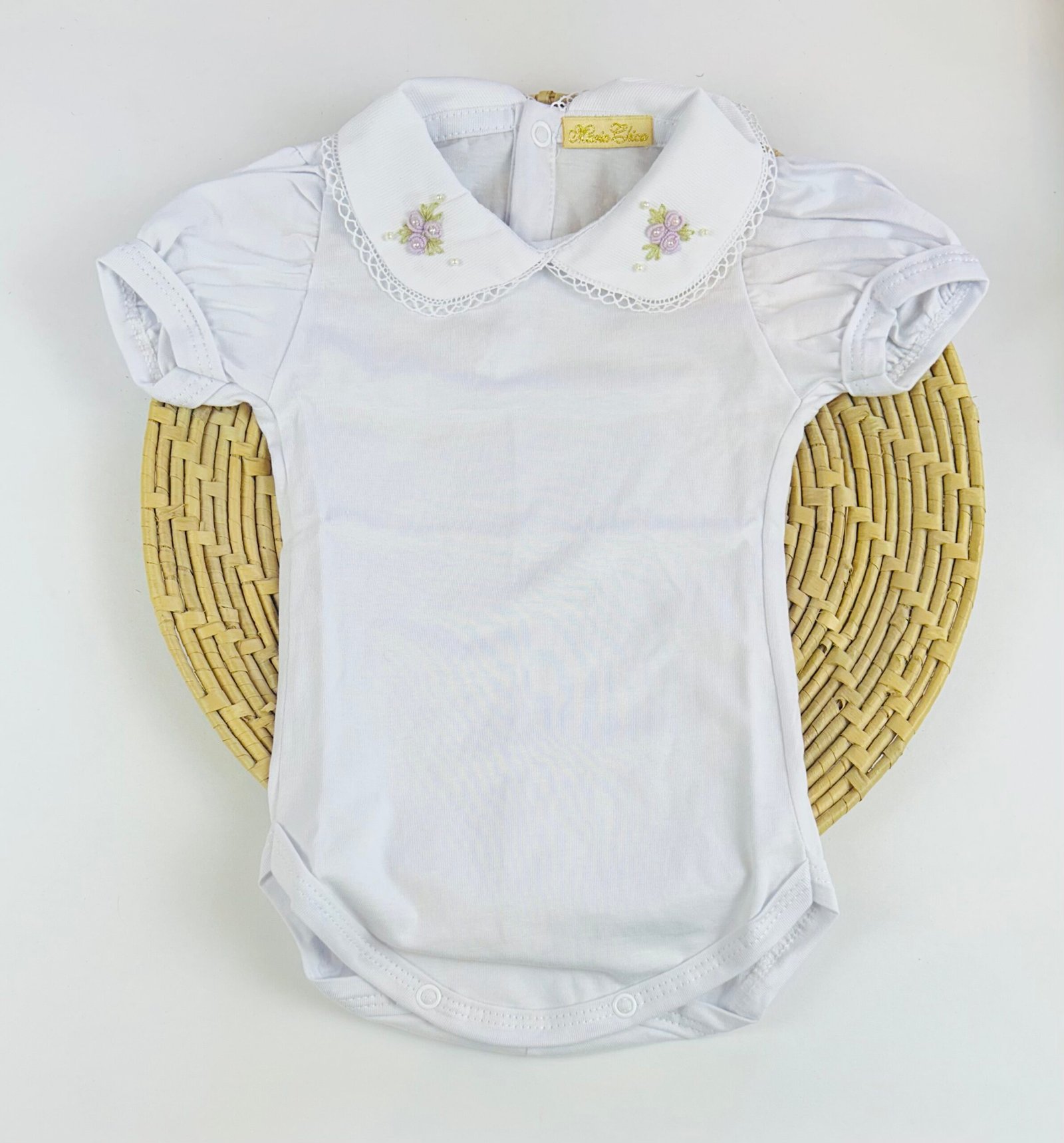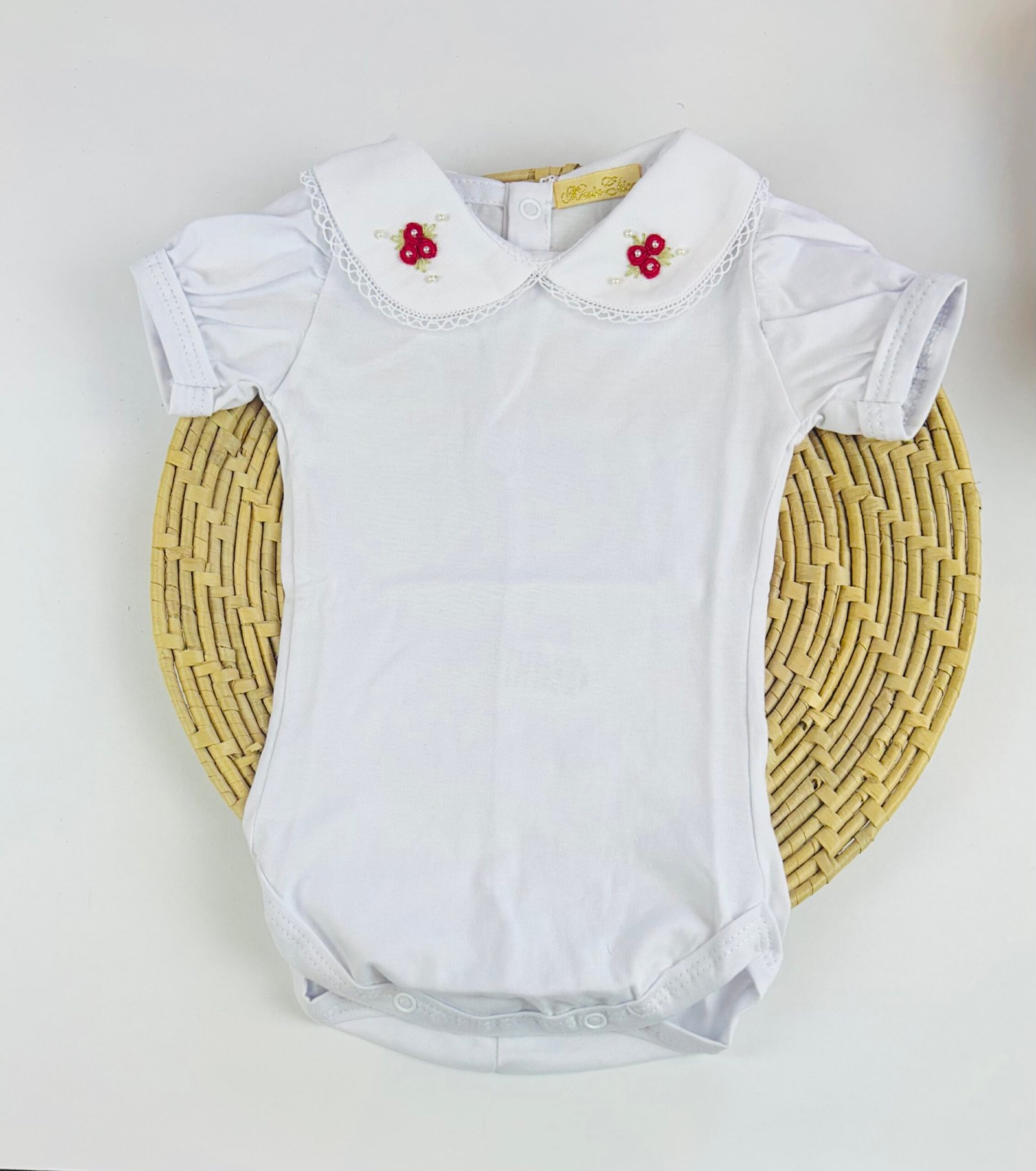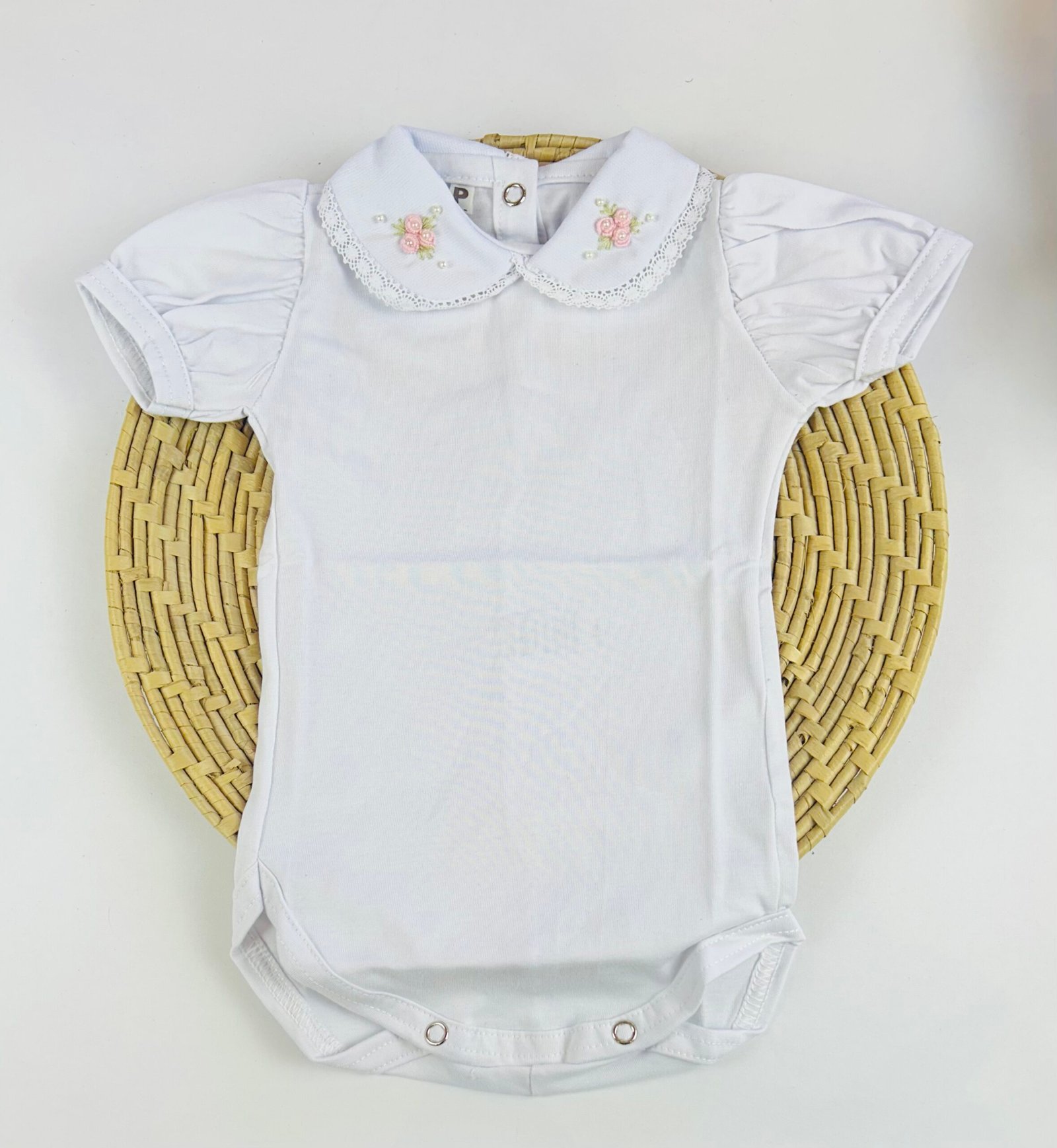 A gola bordada à mão com flores em rococó e aplicações de pérolas traz um charme especial, tornando o body perfeito para compor produções elegantes — seja para passeios, eventos, batizados ou para completar saídas de maternidade.