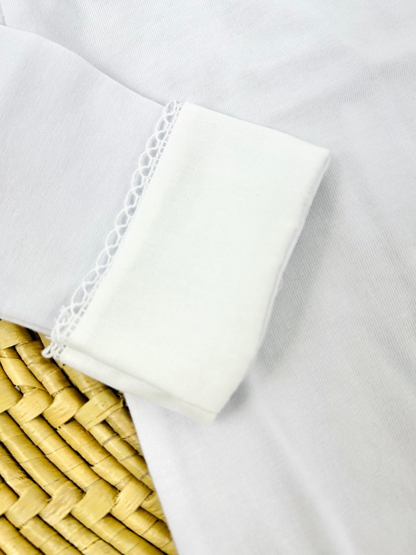 O modelo possui gola branca com renda delicada e bordado floral feito à mão, trazendo um toque artesanal e atemporal à peça. As mangas longas oferecem proteção térmica e conforto, sendo perfeitas para o dia a dia, para a saída da maternidade ou para ocasiões especiais.