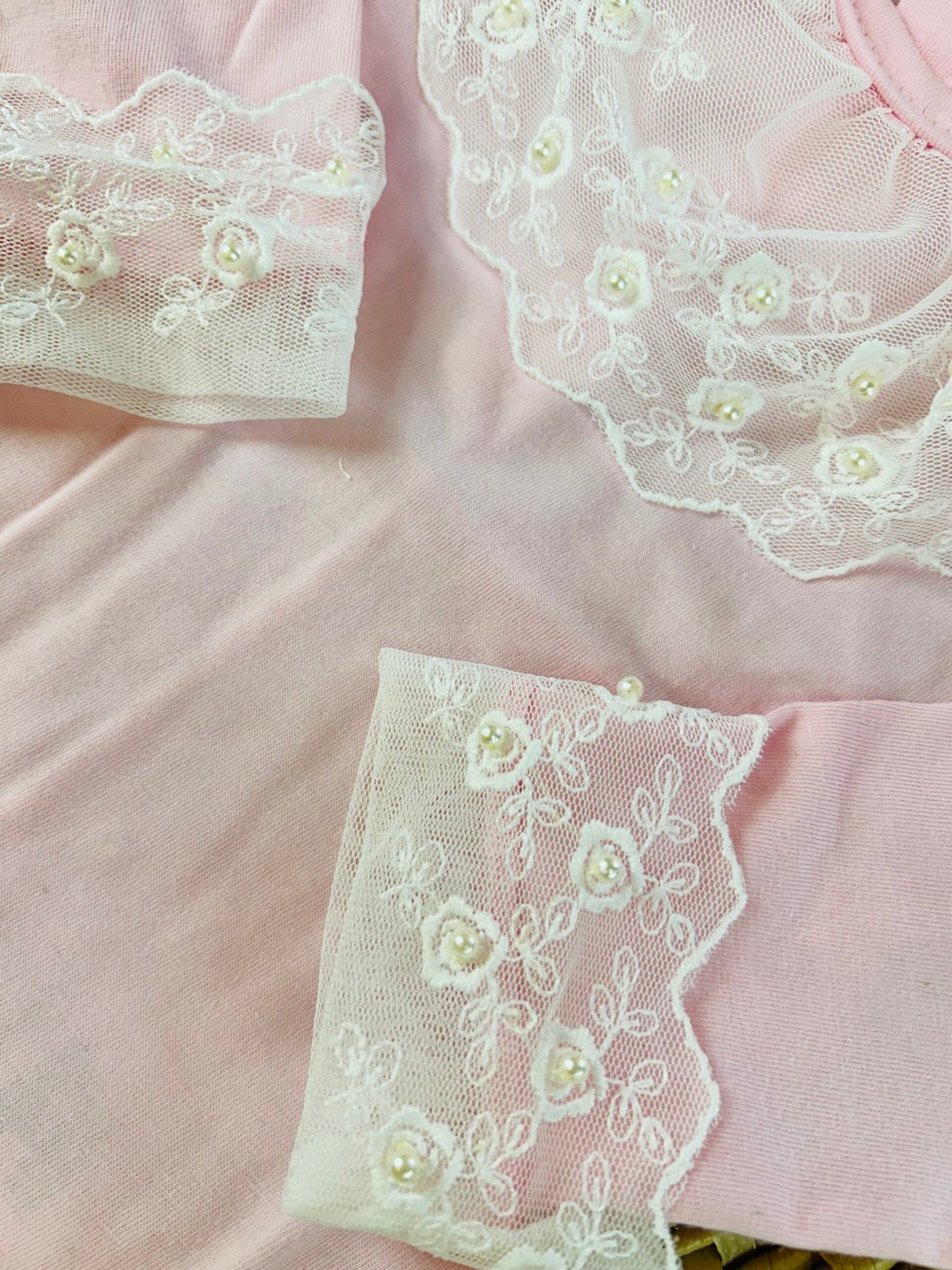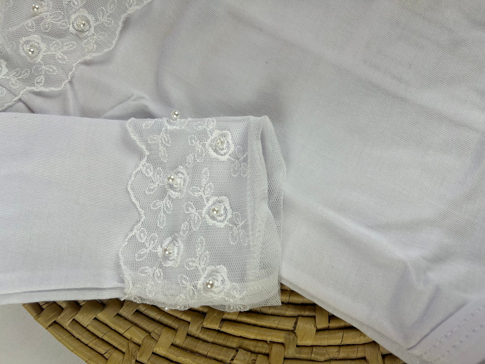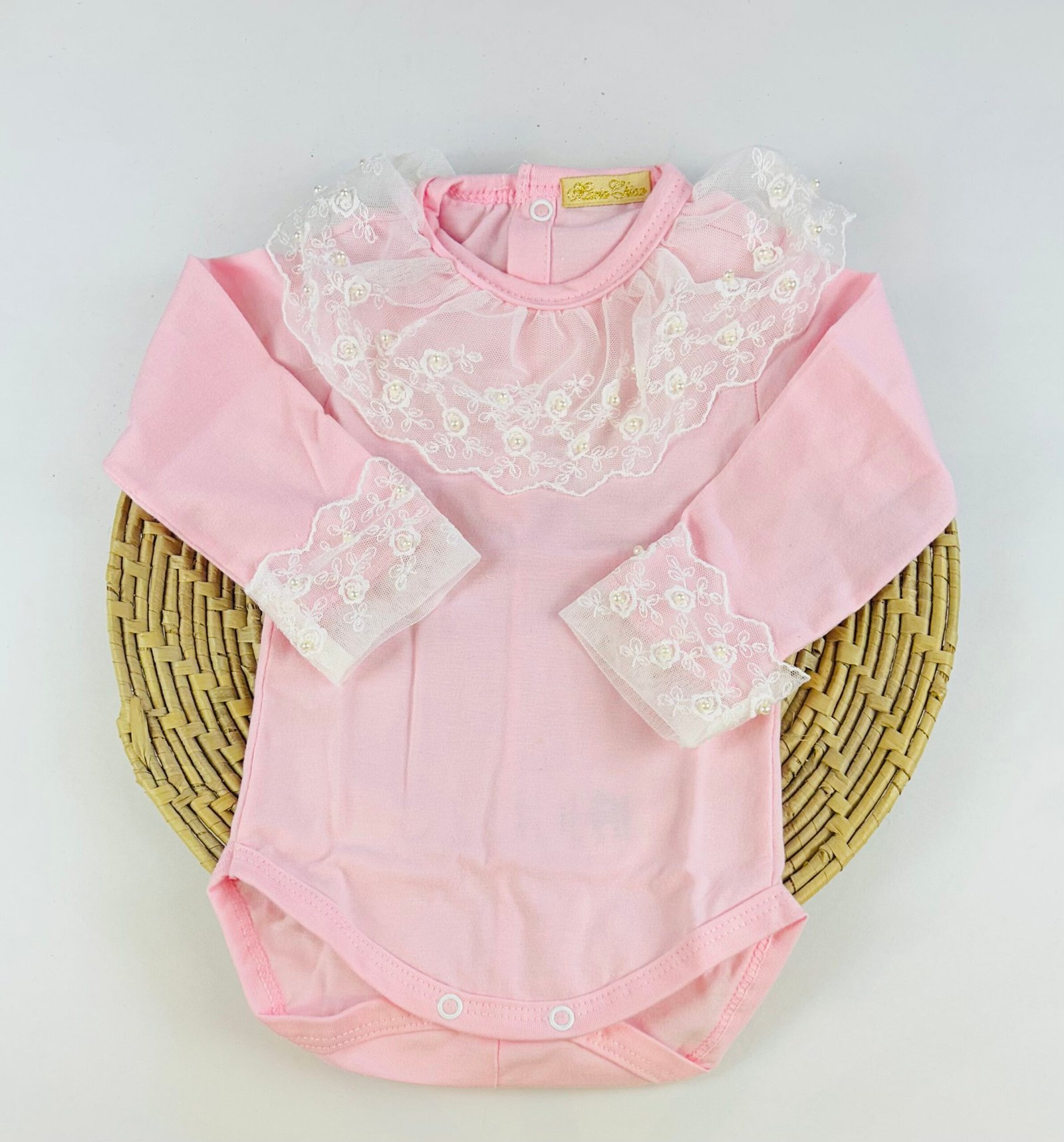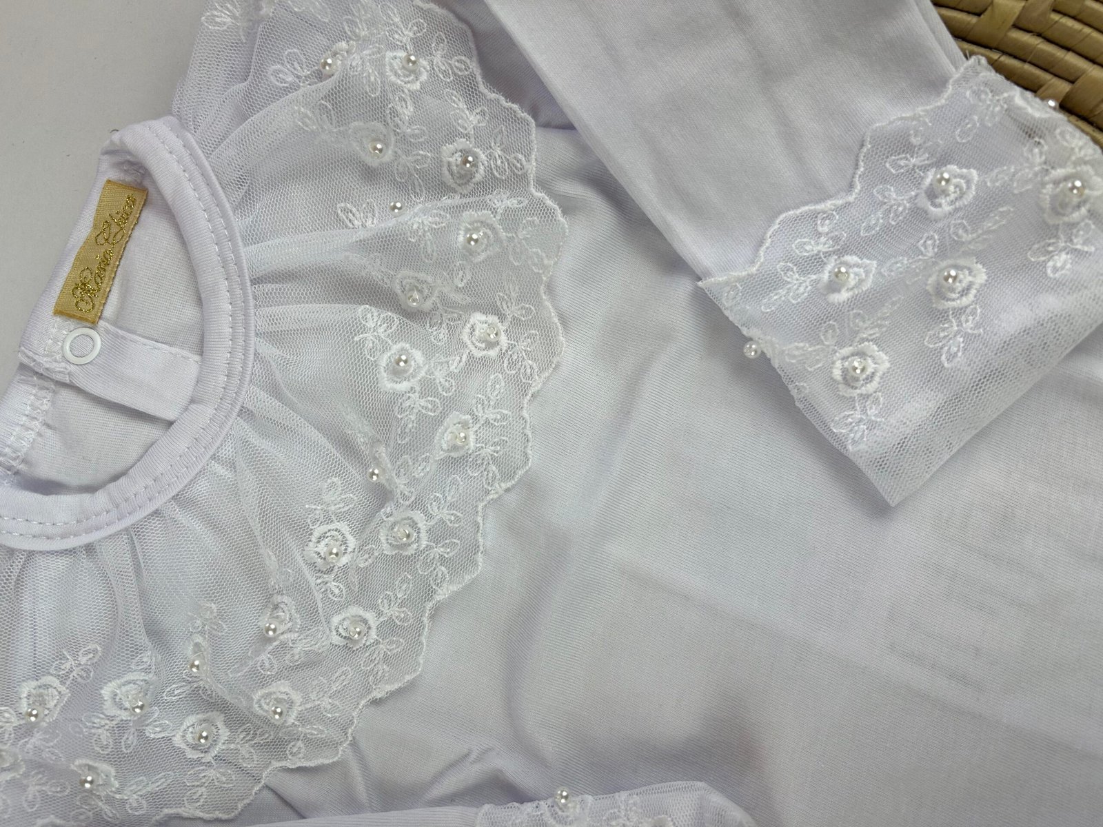 O modelo possui detalhes em renda delicada feitos à mão, presentes na gola e nos punhos, que trazem um toque artesanal, romântico e sofisticado à peça. As mangas longas oferecem proteção térmica, tornando o body ideal para ocasiões especiais, fotos ou para compor looks delicados desde a maternidade.
