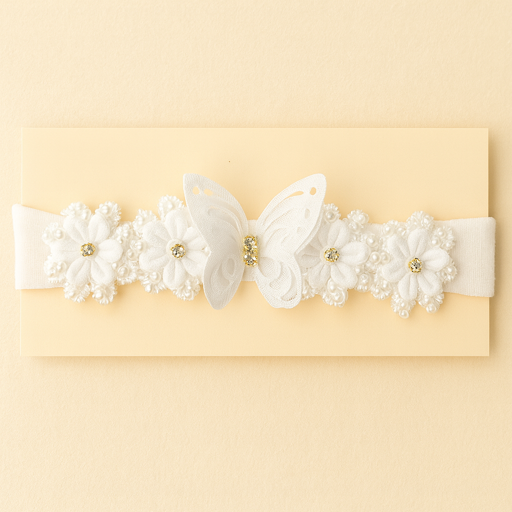 O destaque especial fica por conta da borboleta rendada, acompanhada por flores com pérolas e cristais, que trazem brilho, elegância e um toque de magia ao visual. Ideal para batizados, aniversários, ensaios fotográficos e também para momentos casuais cheios de encanto. 🌸
