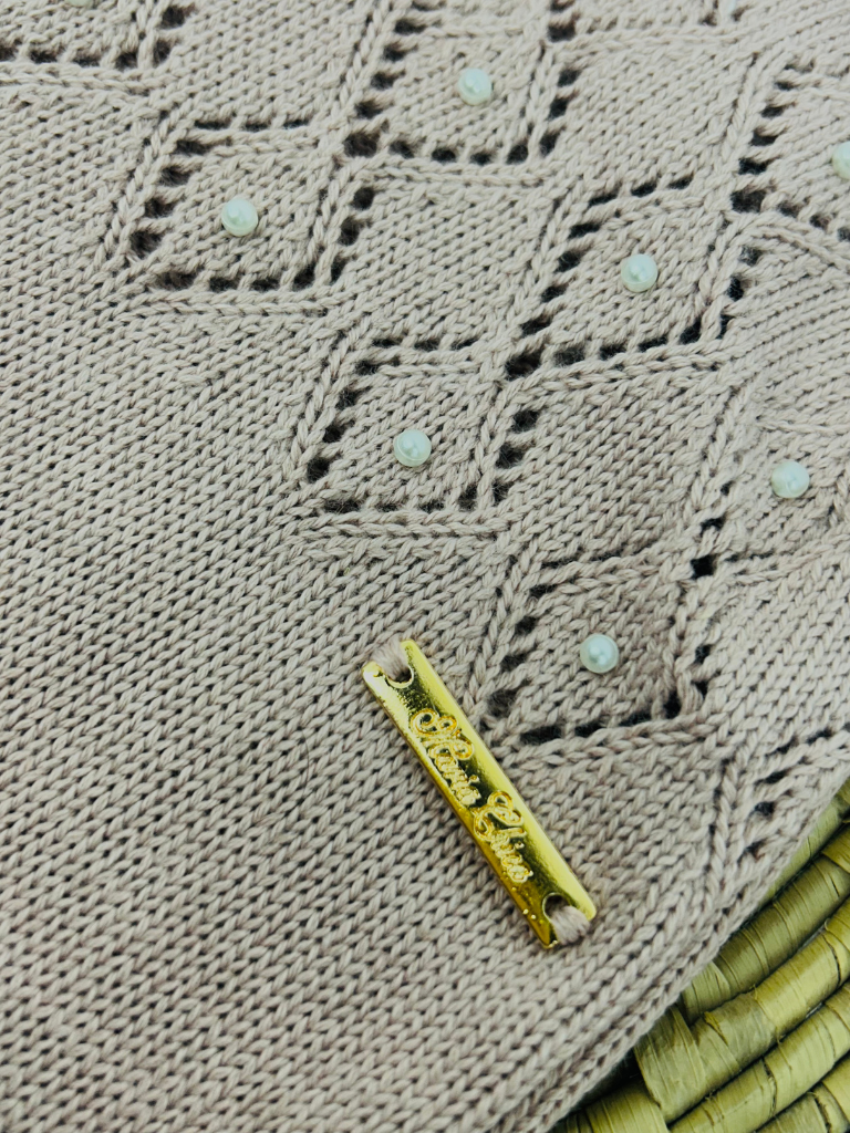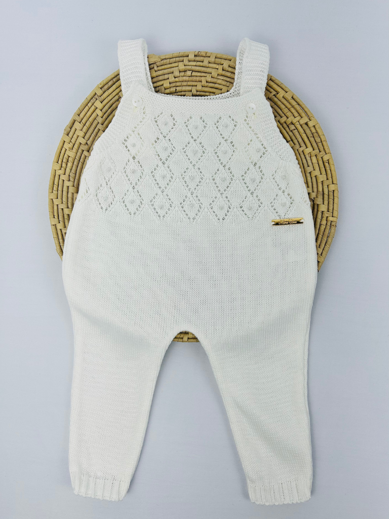 Jardineira do tipo jardineira, com alças e fechamento por botões na parte frontal. A peça apresenta detalhes vazados na parte superior e aplicação de pérolas distribuídas no desenho do tecido. O modelo é inteiro, com pernas longas e acabamento ajustado na barra.