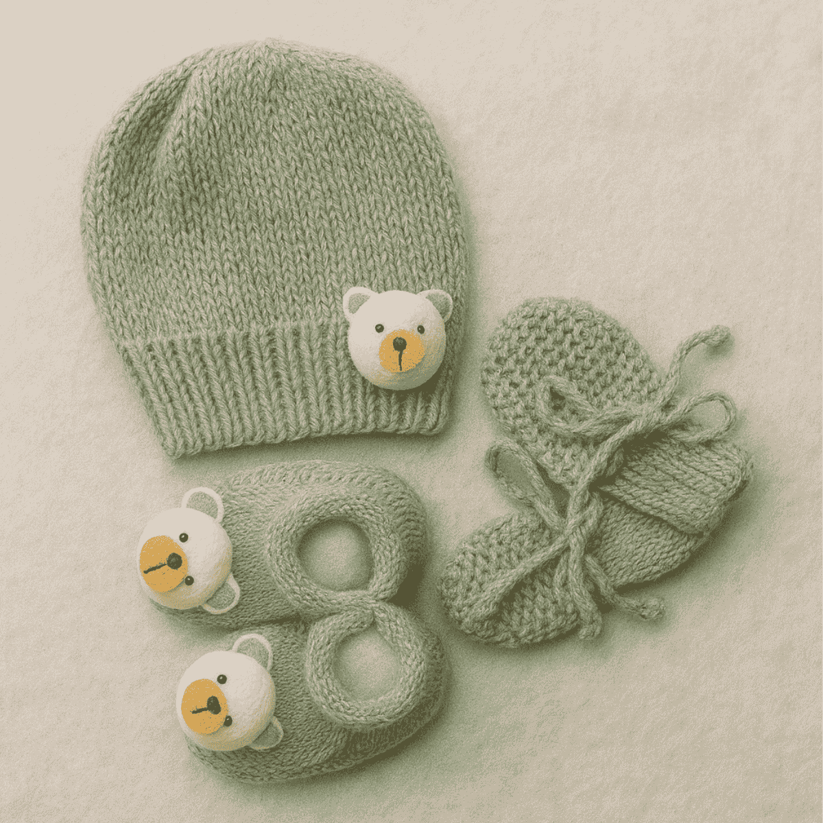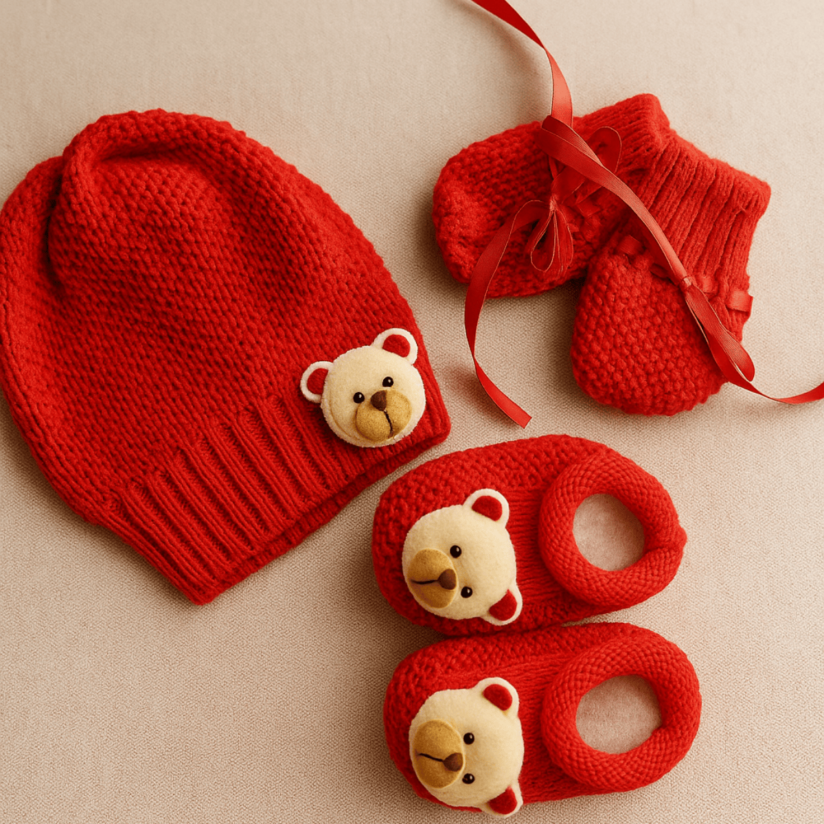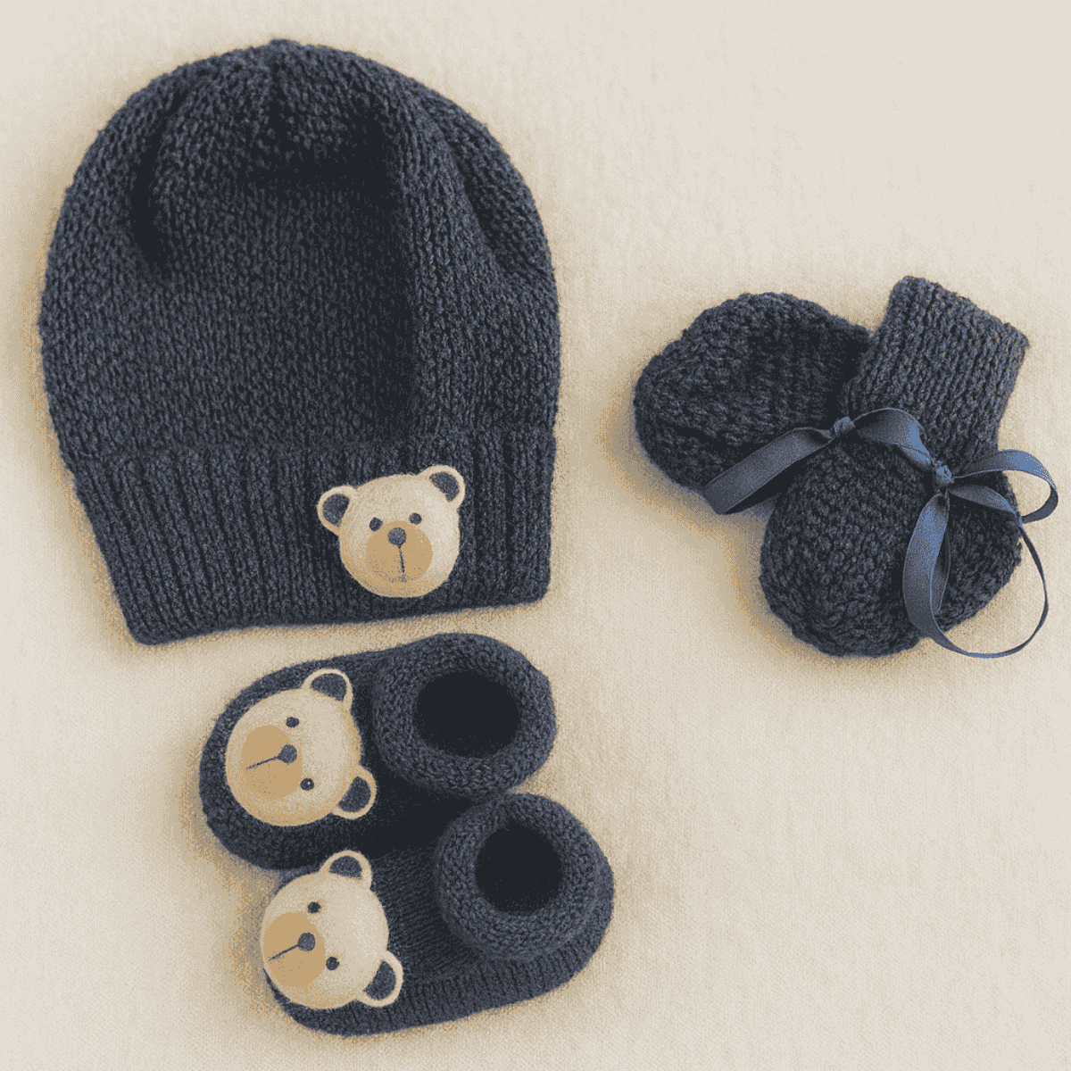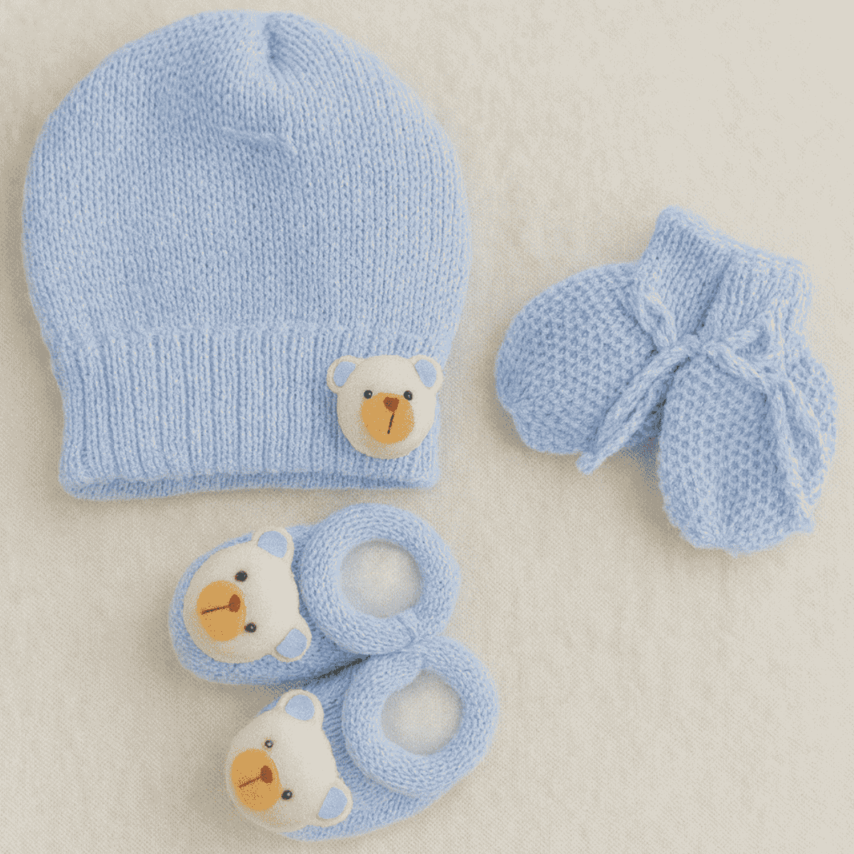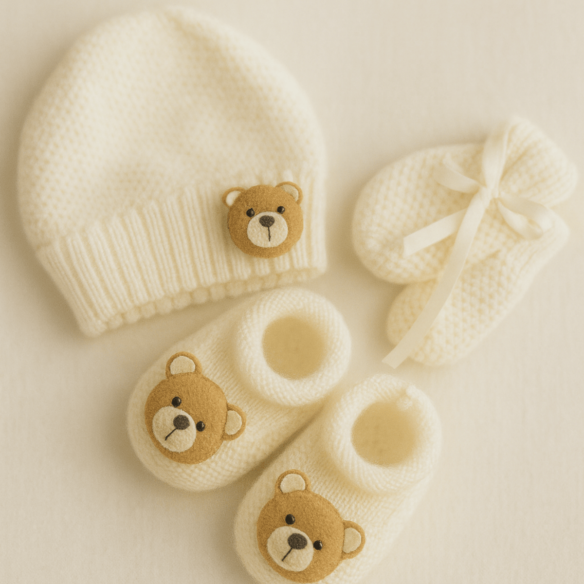 O kit inclui um par de sapatinhos e um par de luvinhas combinando, ambos decorados com um aplique de ursinho encantador, que adiciona um toque lúdico e carinhoso ao visual. 🧶