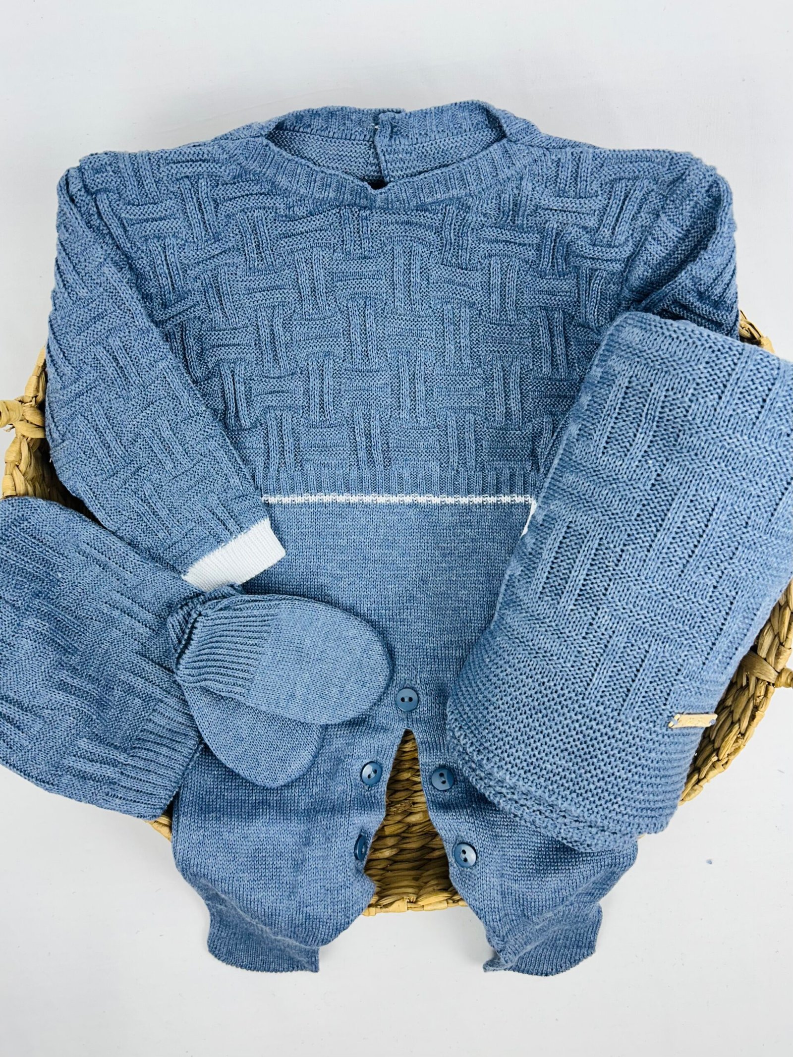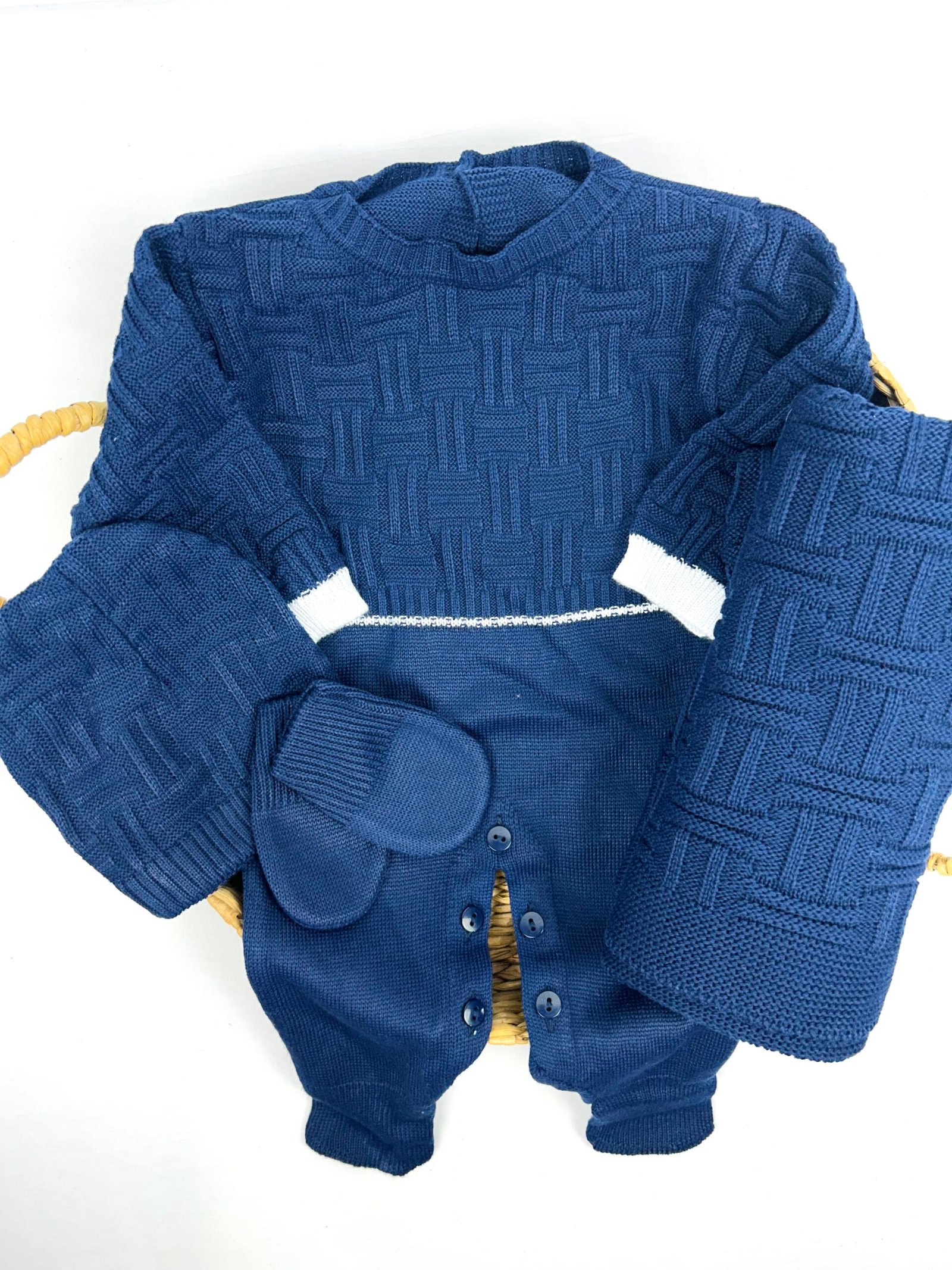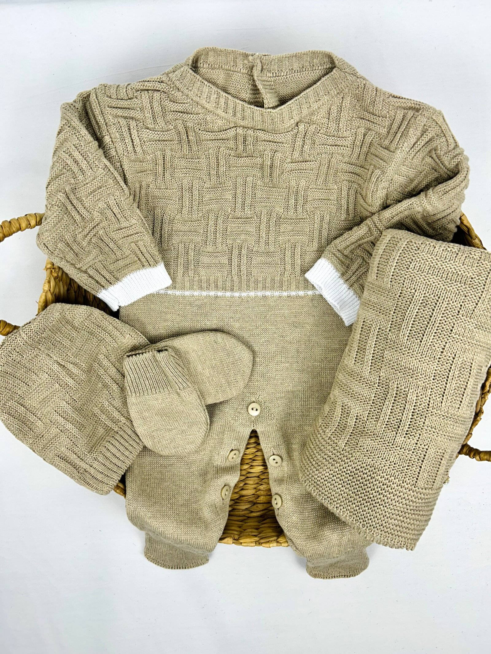 Manta coordenada: confeccionada no mesmo tricot sofisticado, perfeita para envolver o bebê com carinho