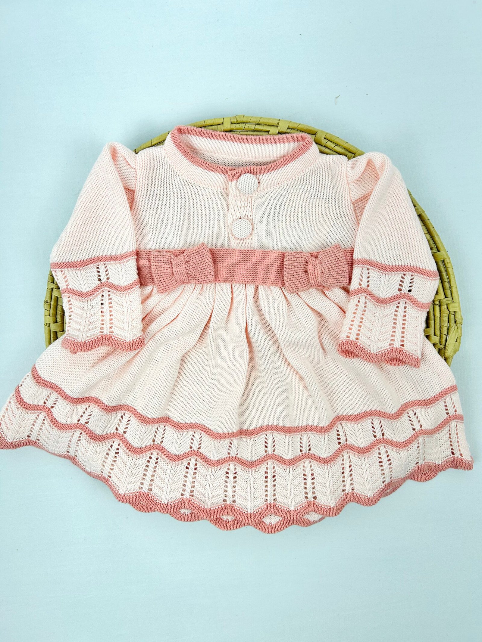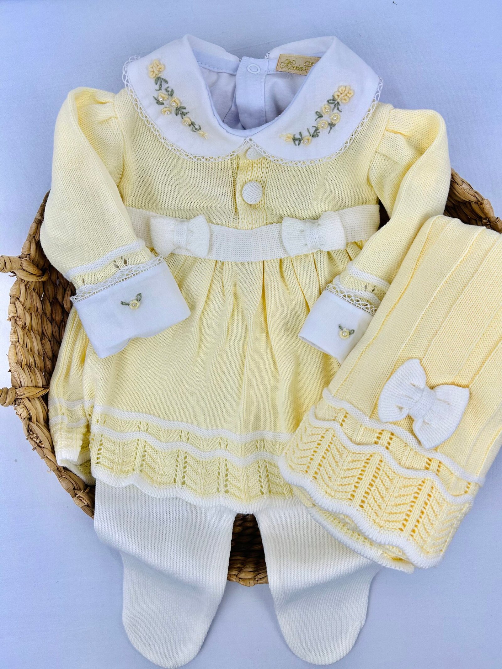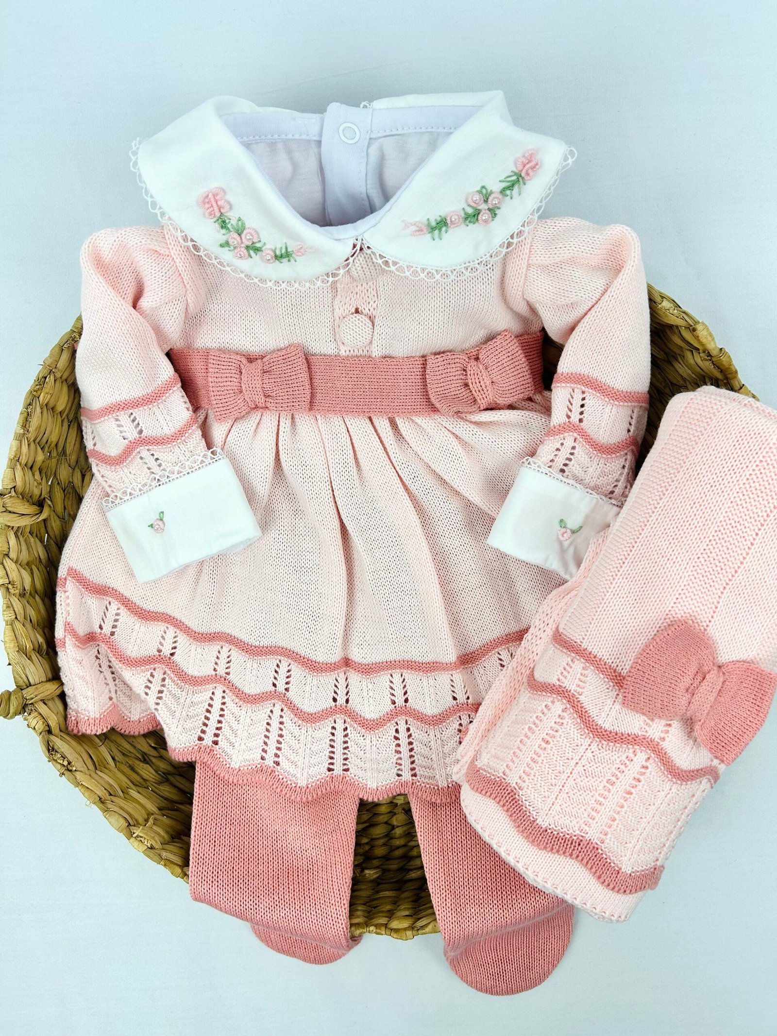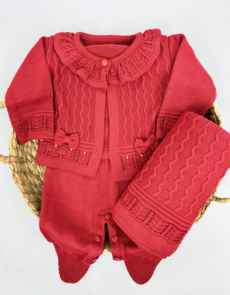 Saída maternidade Carolina 3 peças conforme apresentada na imagem. O conjunto é composto por vestido, calça e manta, seguindo o mesmo padrão entre as peças.