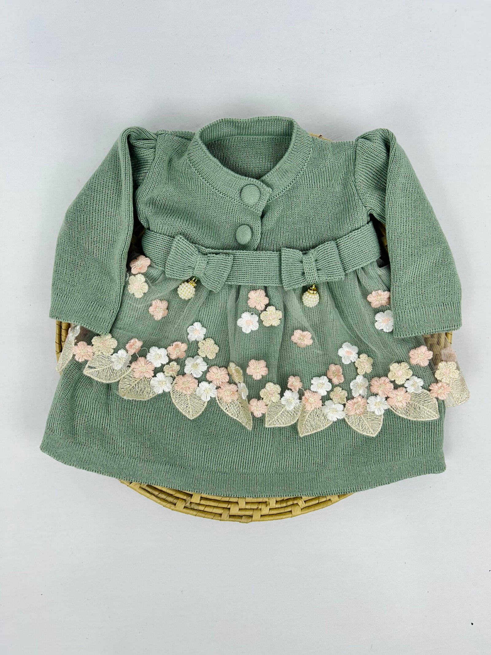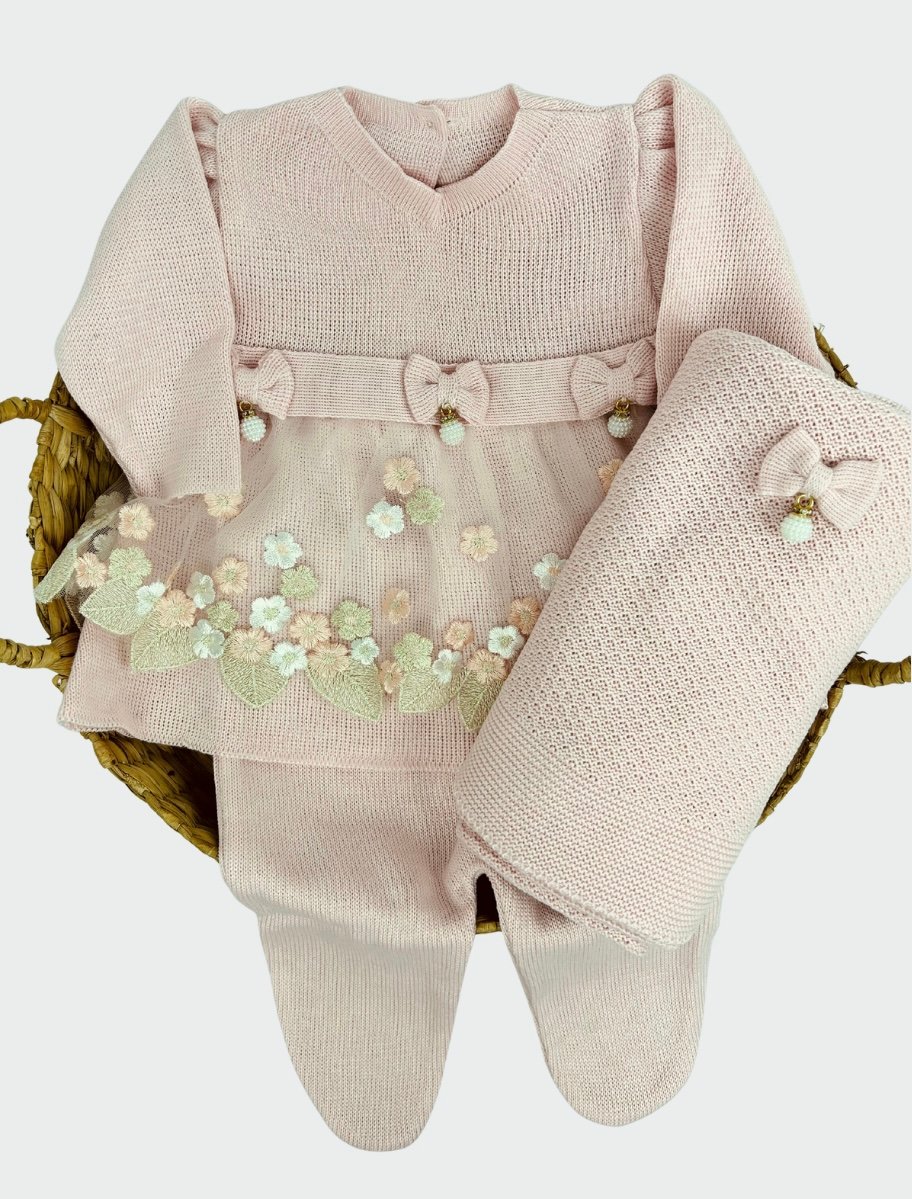 Saída de maternidade em tricô com detalhes florais e acabamento artesanal, produzida com cuidado pela Maria Chica Bebê.