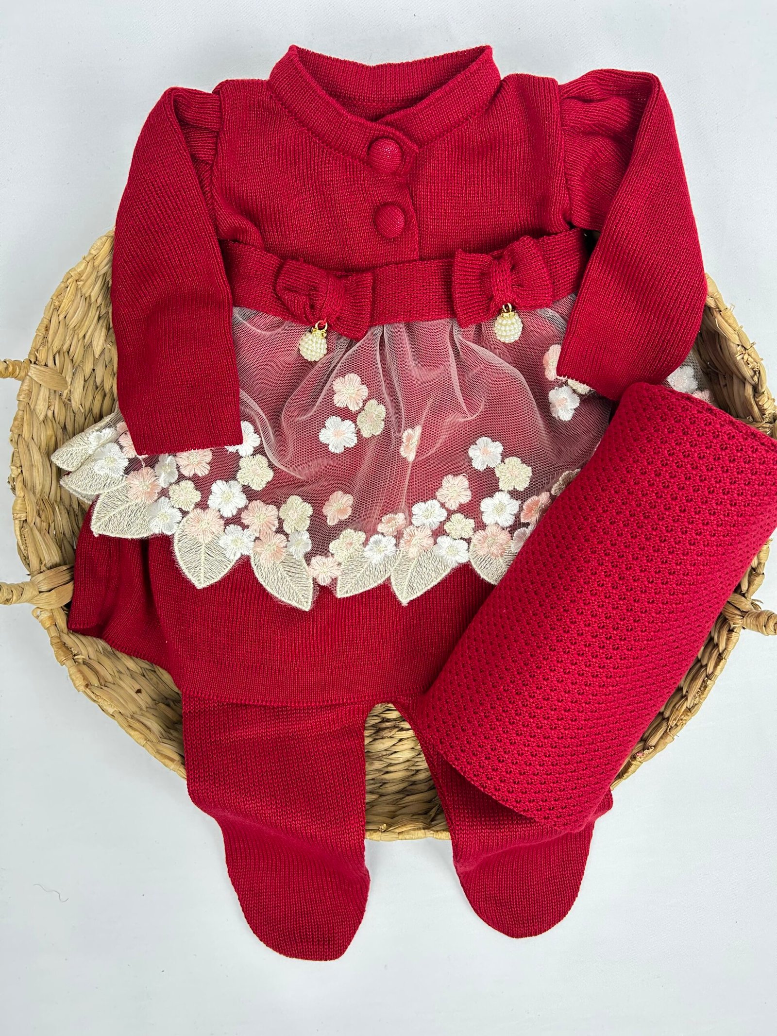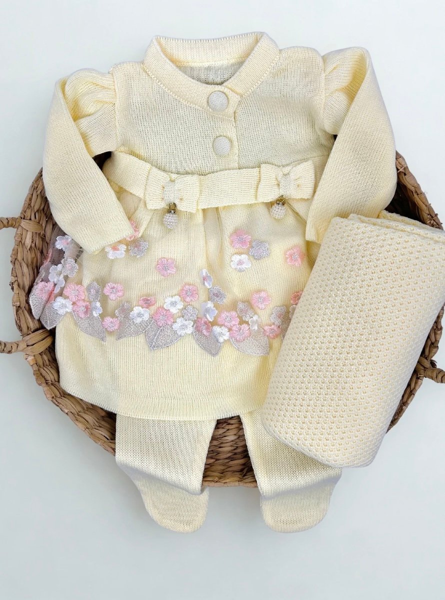 A calça com pezinho complementa o conjunto, mantendo o bebê aquecido com conforto e caimento perfeito. Acompanha também uma manta em tricô coordenada, ideal para envolver o bebê com delicadeza na maternidade e nos primeiros passeios.