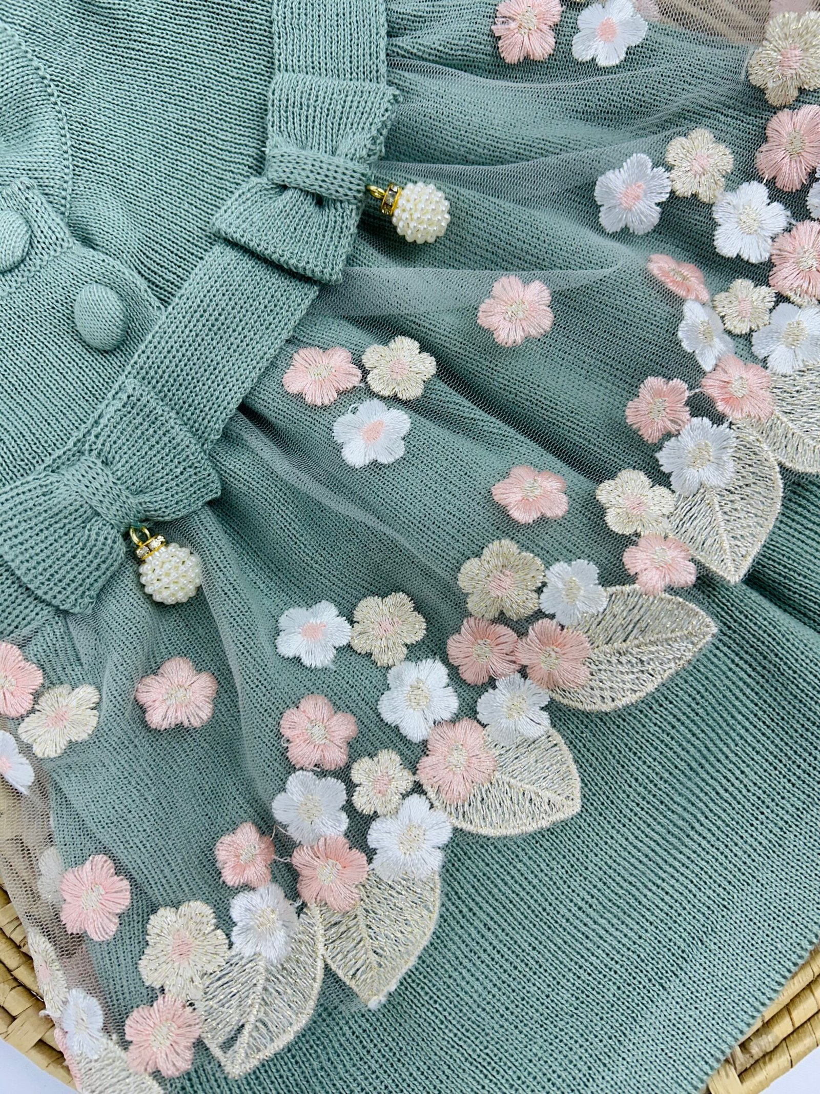 O conjunto é composto por uma blusa em tricô com mangas longas, que apresenta detalhe frontal em tule delicado com aplicações florais bordadas, criando um visual romântico e refinado. O destaque fica por conta dos laços aplicados na cintura, acompanhados de pequenos pingentes, que valorizam o acabamento artesanal e conferem charme exclusivo à peça. O fechamento frontal facilita o vestir e as trocas.