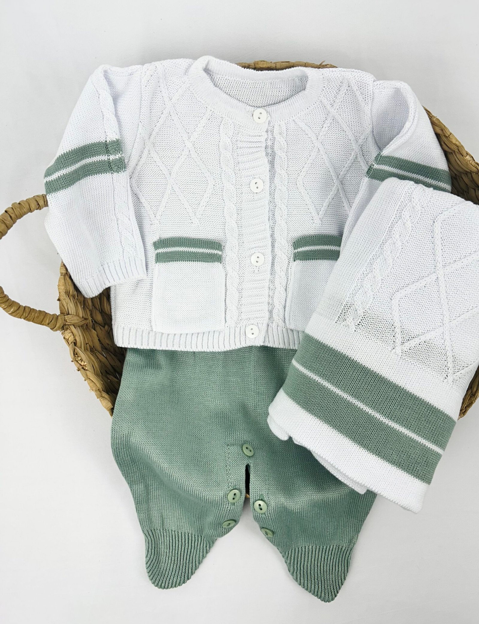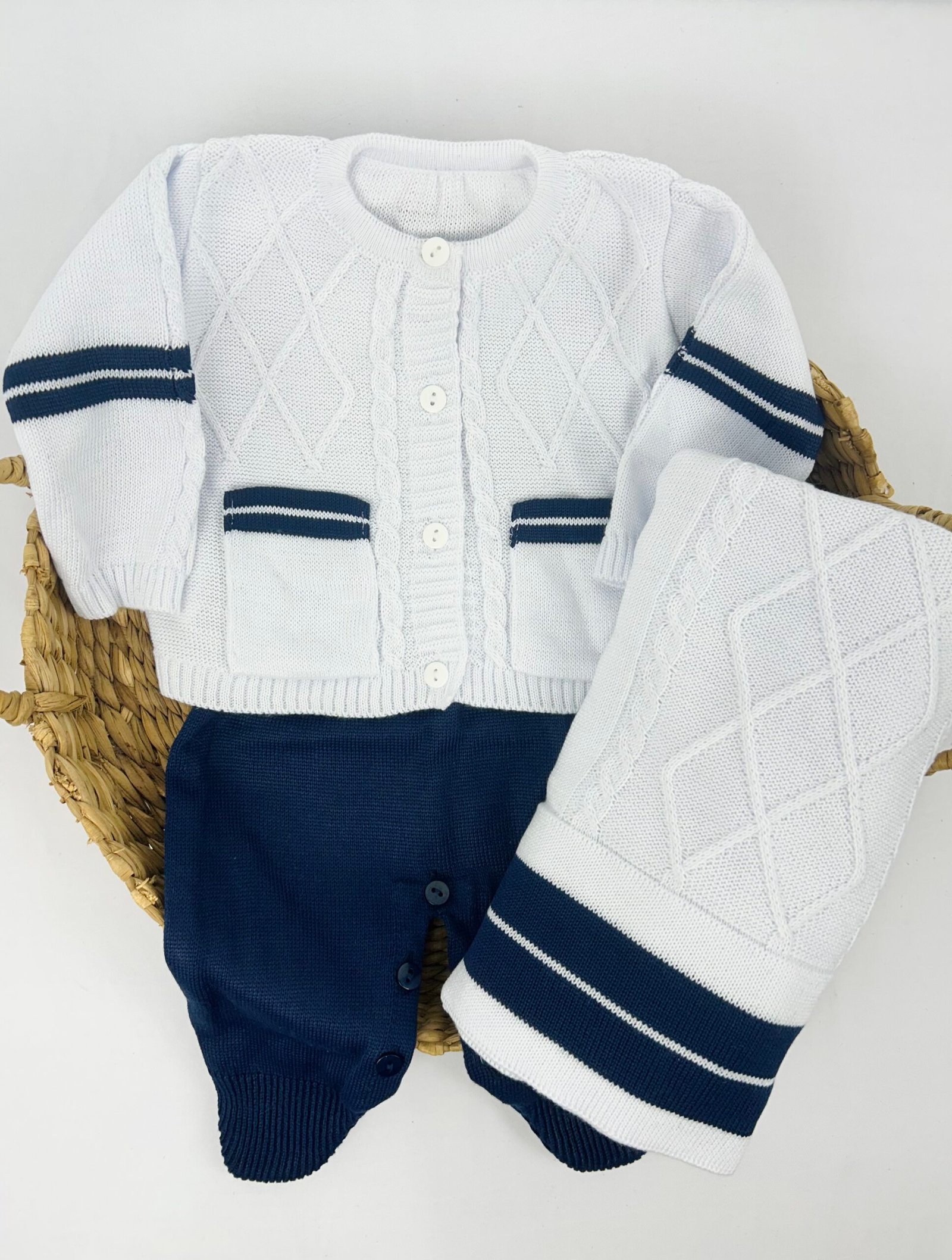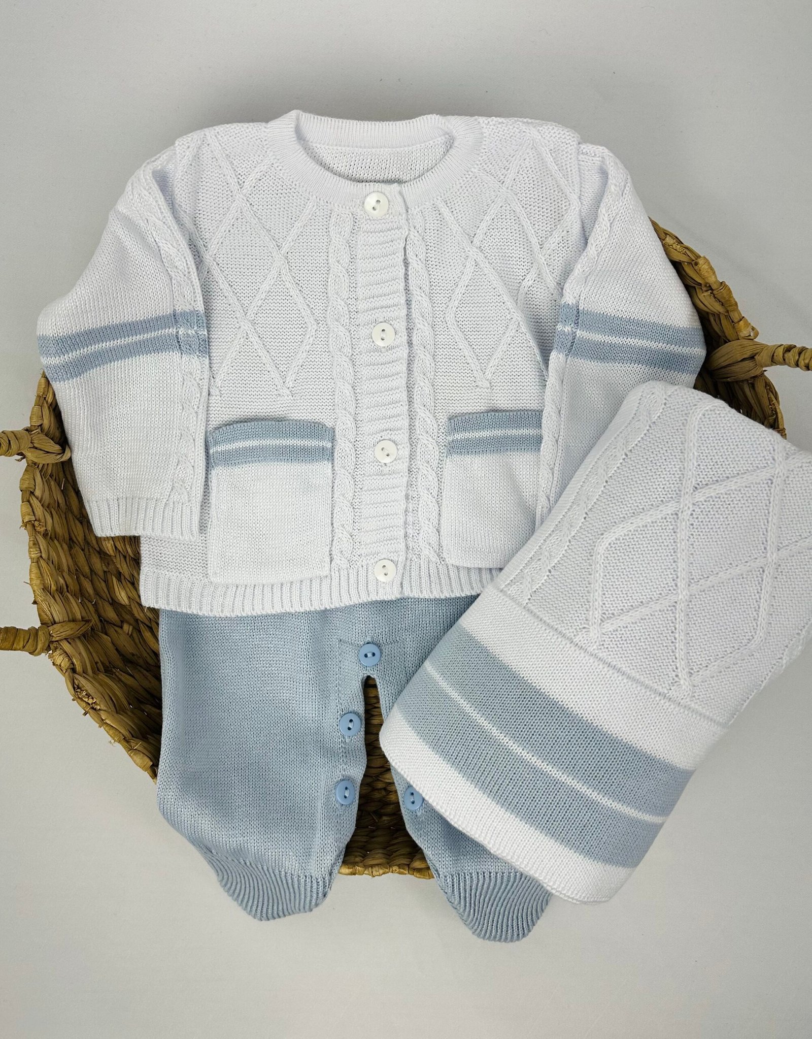 Saída de Maternidade Acassio composta por 3 peças, com cassaquinho e jardienira em tricot acompanhados de manta. As peças seguem o mesmo conjunto, com acabamento em tricot conforme apresentado na imagem.