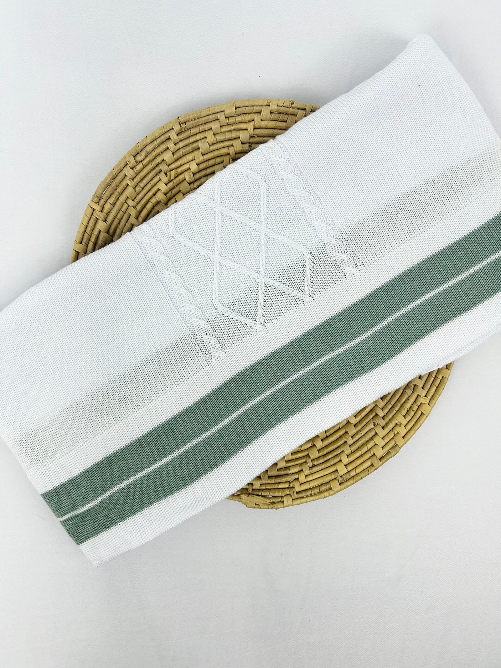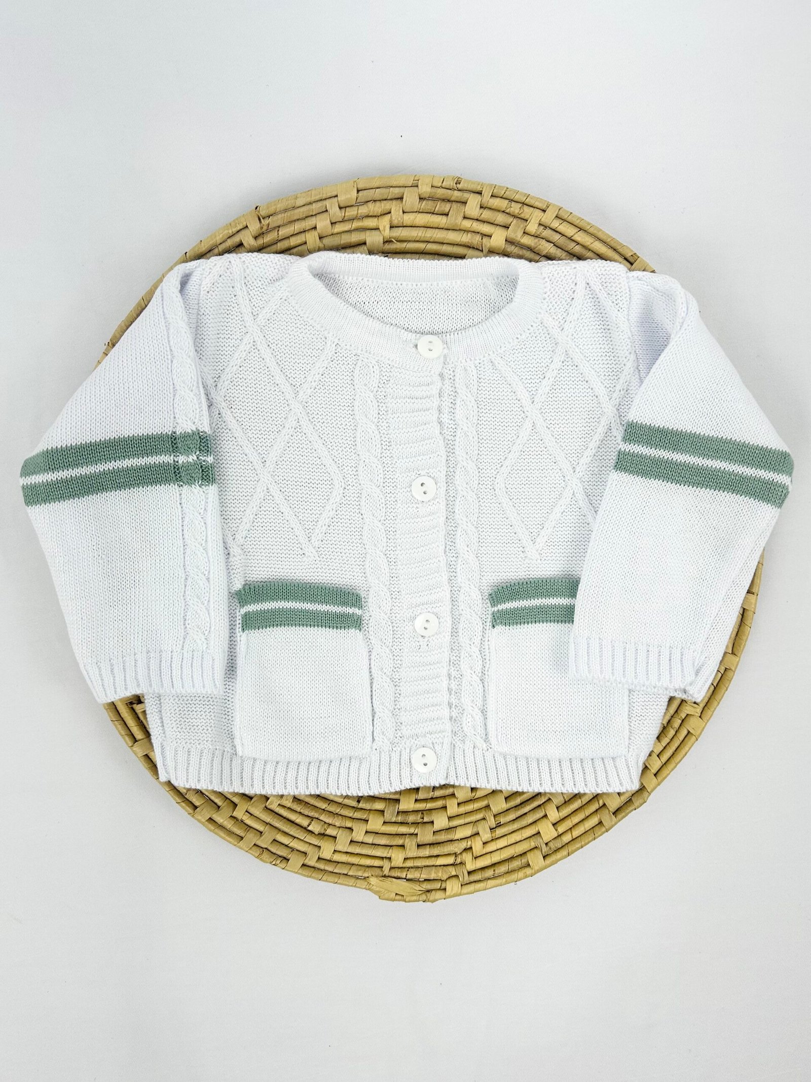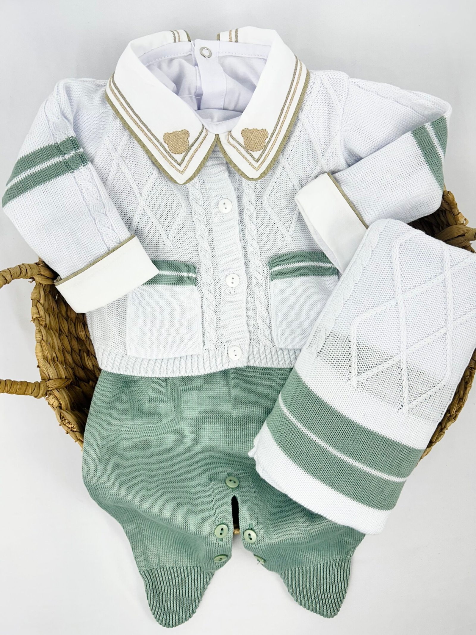 Saída de Maternidade Acassio composta por 3 peças, com cassaquinho e jardienira em tricot acompanhados de manta. As peças seguem o mesmo conjunto, com acabamento em tricot conforme apresentado na imagem.