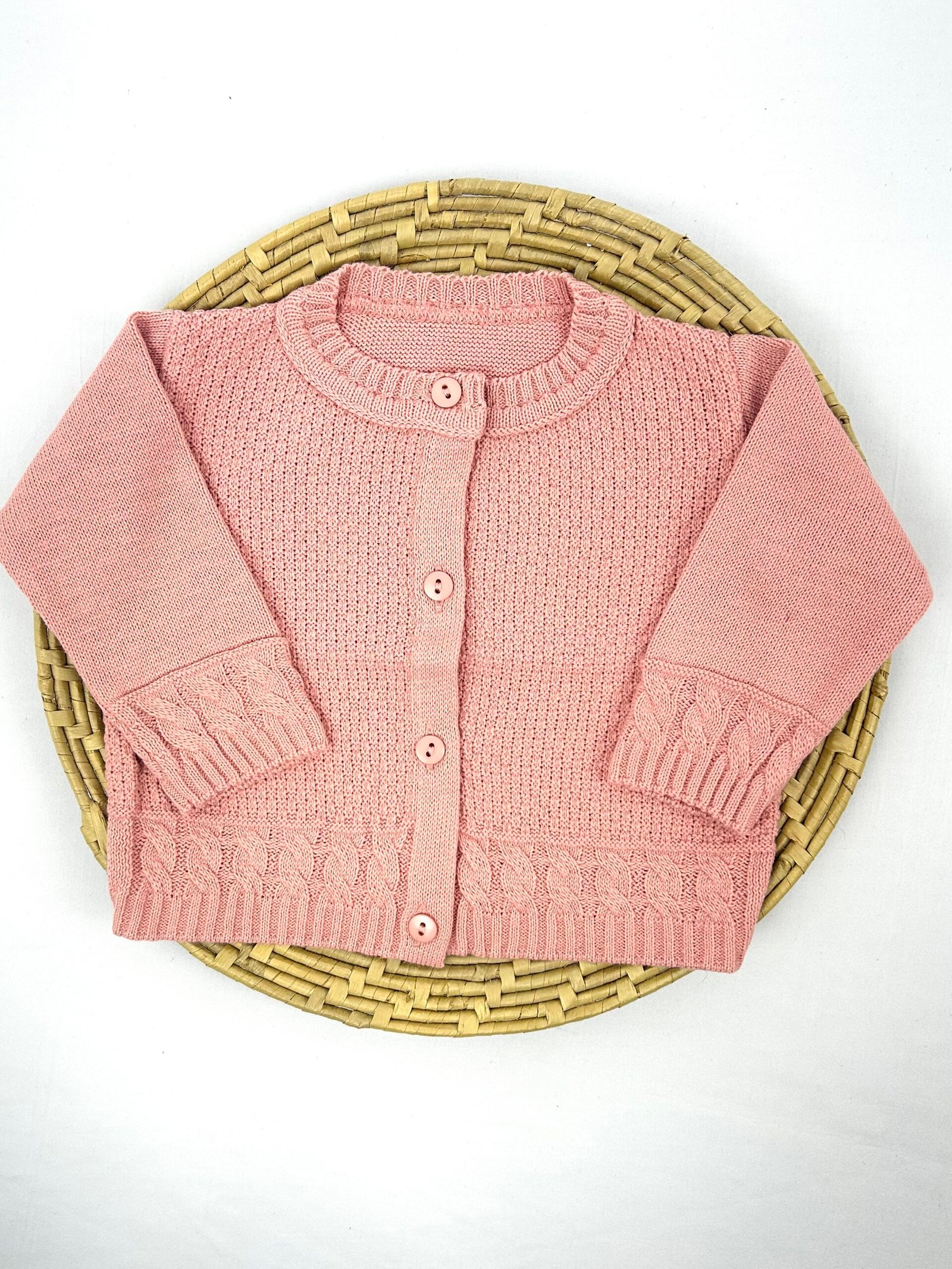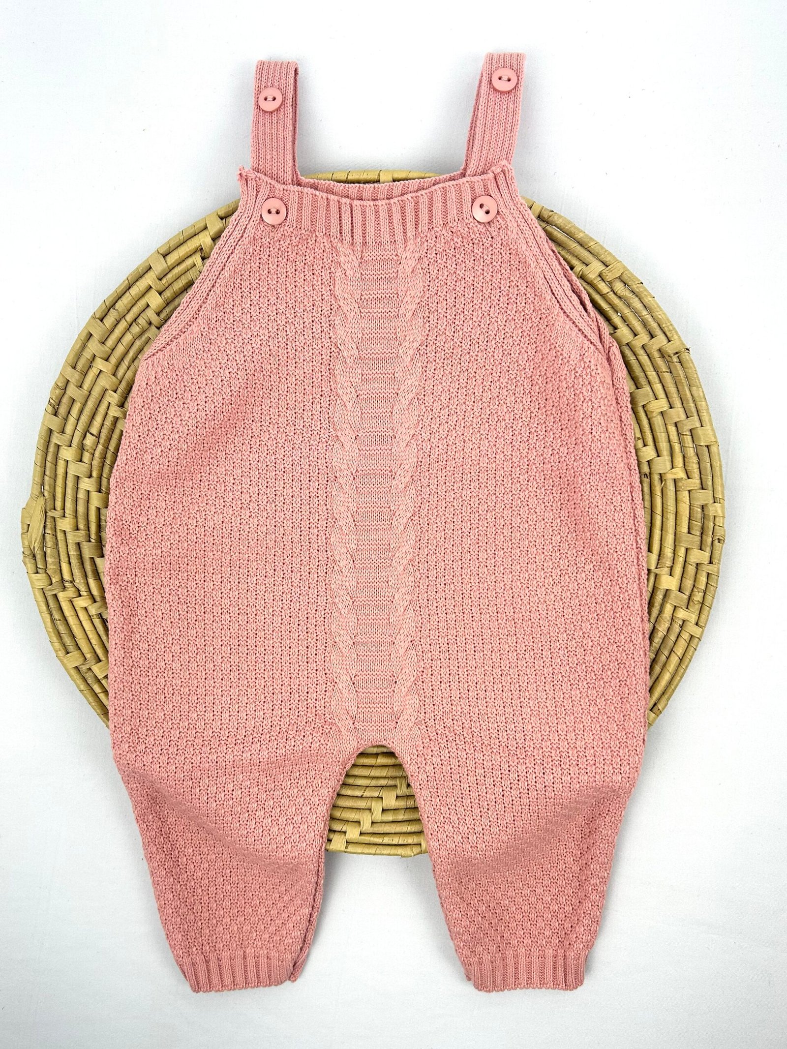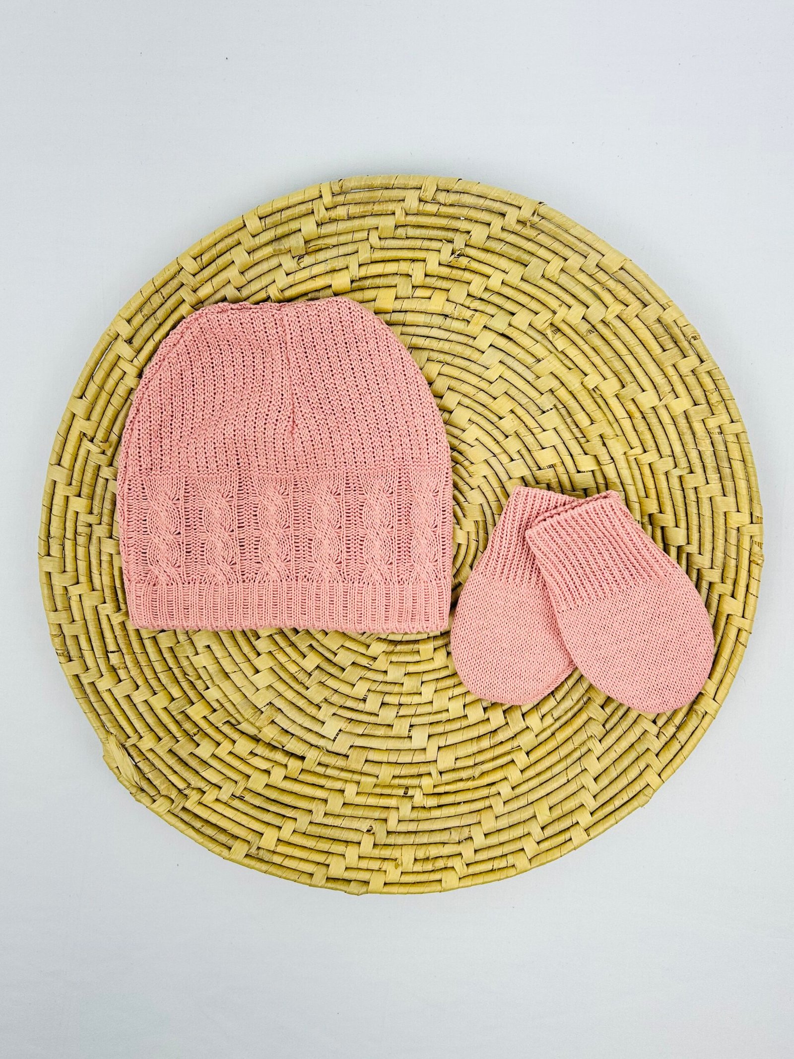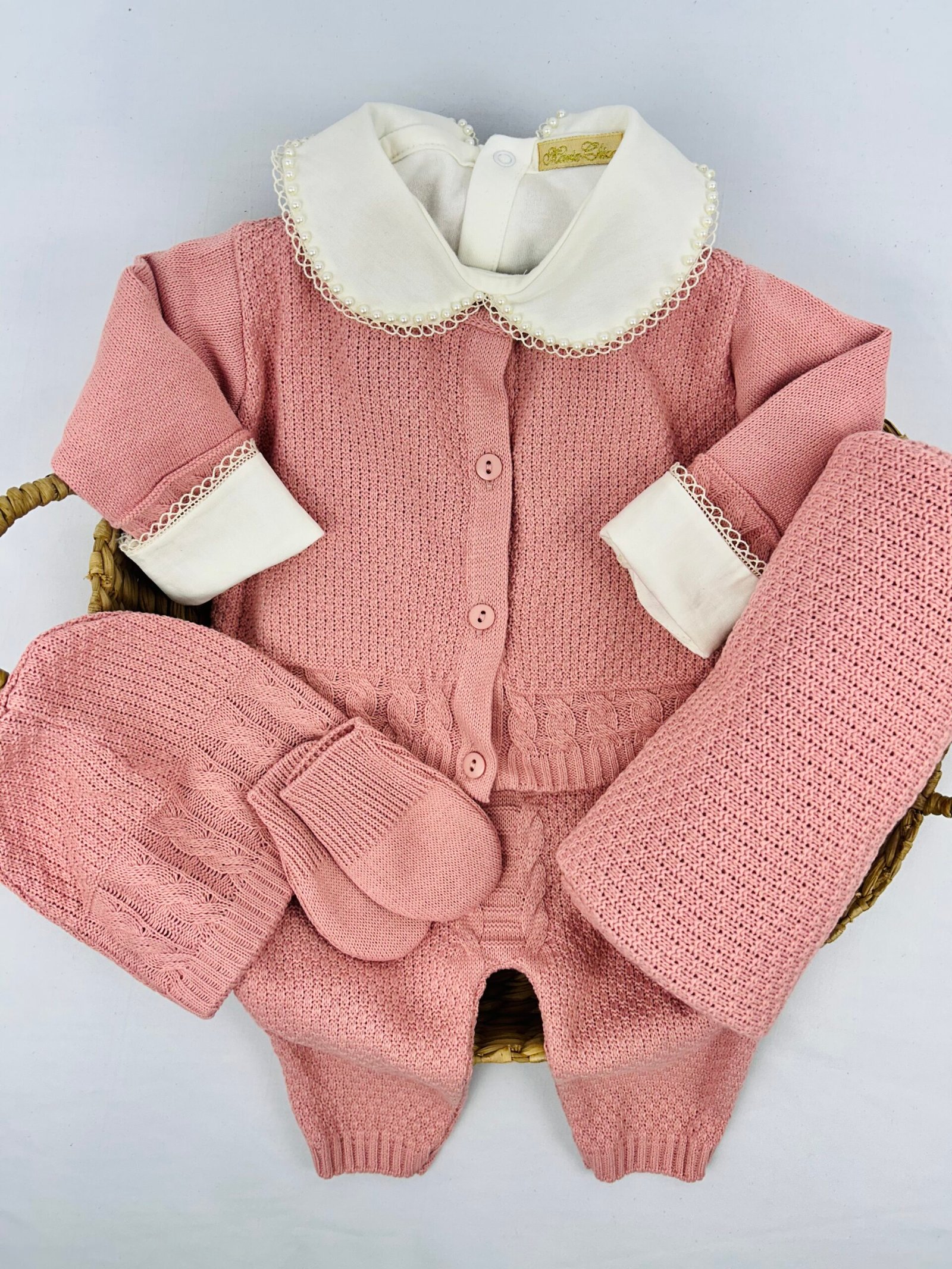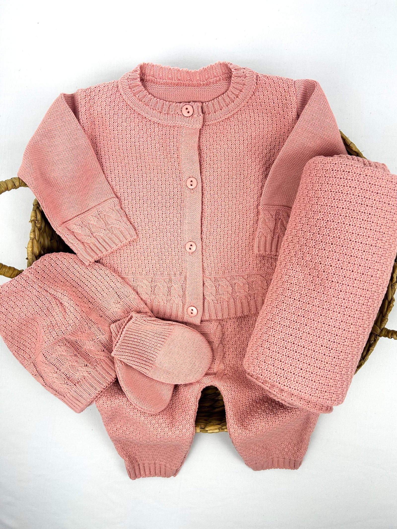 Saída Maternidade Nivia composta por cinco peças, apresentada em tom rosado, conforme imagem. O conjunto inclui cassaquinho com fechamento frontal e gola clara, jardineira, manta, luvas e touca, todas seguindo o mesmo padrão visual. As peças formam um conjunto coordenado, com acabamento delicado e uniforme.