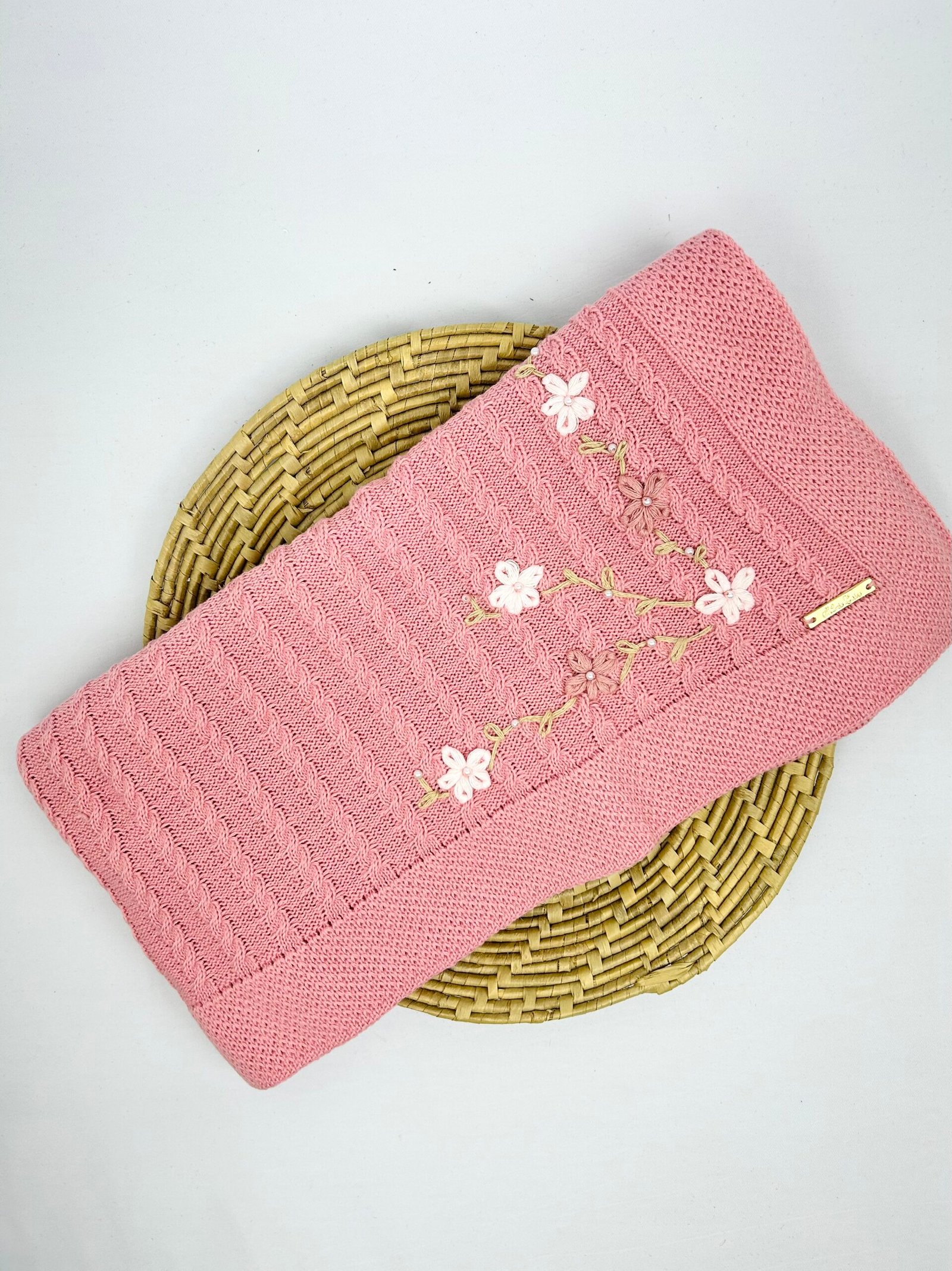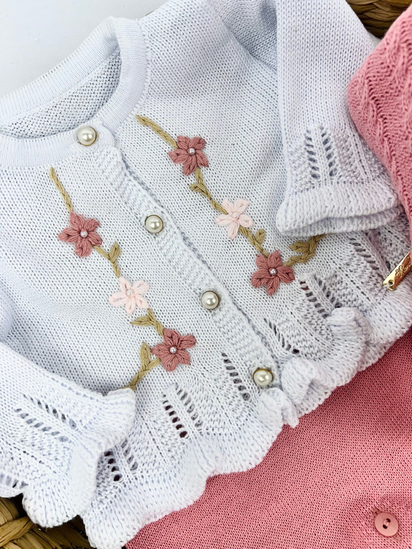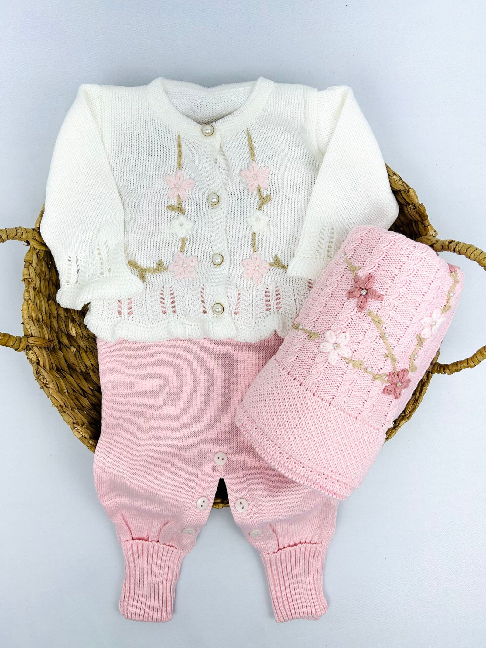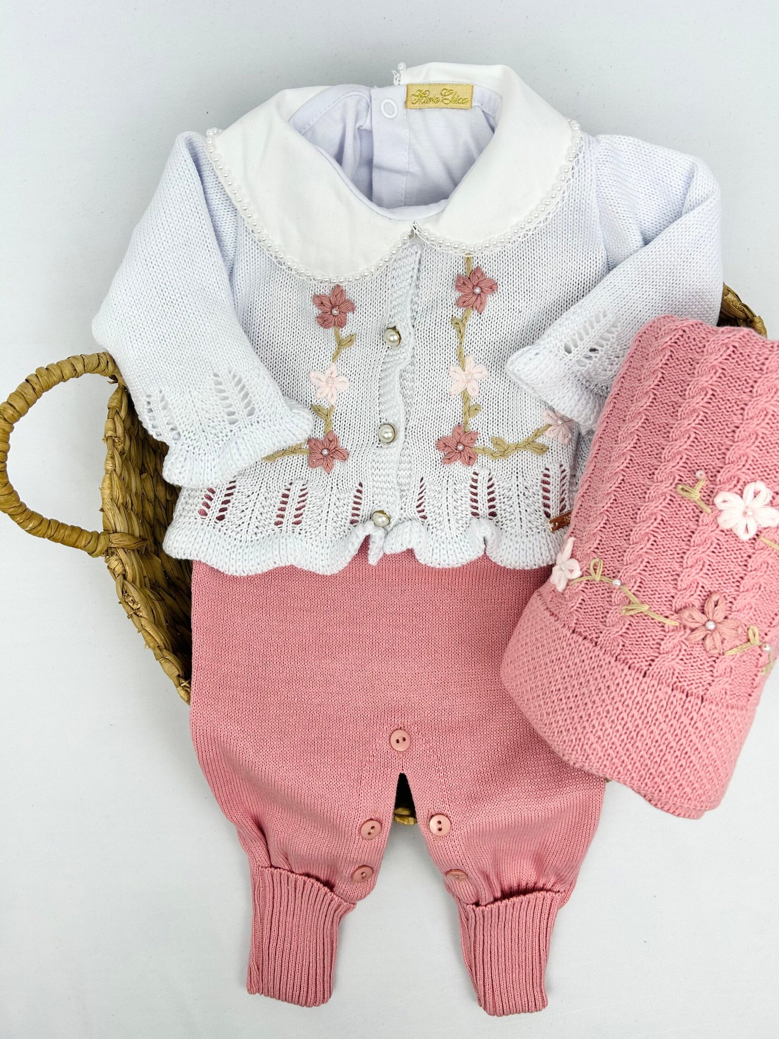 Saída maternidade Veronica com 3 peças: macaçao, manta e casaco. O conjunto foi pensado para os primeiros dias do bebê e segue o mesmo padrão entre as peças, formando um conjunto completo para a maternidade, conforme apresentado na imagem.